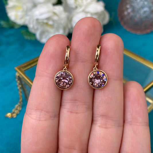 Apzeltīti auskari-riņķīši ar gaiši rozā dekoratīvu kristālu