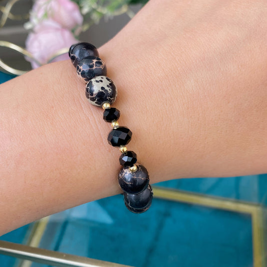 Sniegpārslu Obsidiāna rokassprādze (Obsidiāns, slīpēta forma, 6mm. Drosmei, radošumam un balansam.)