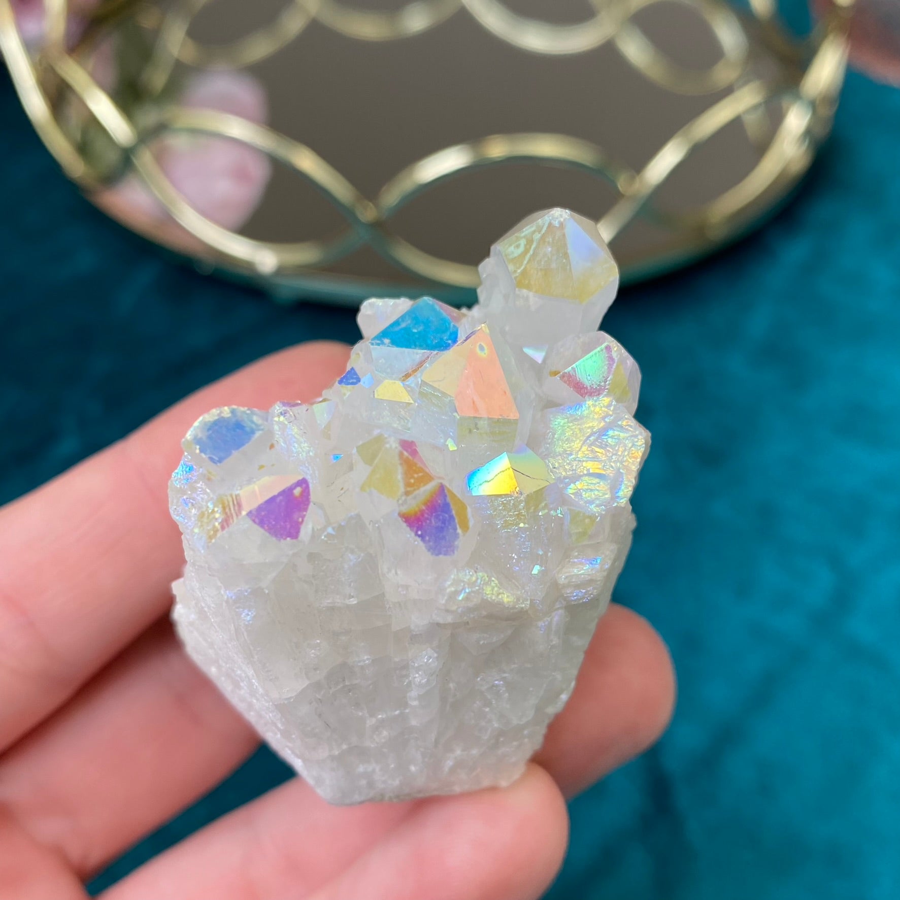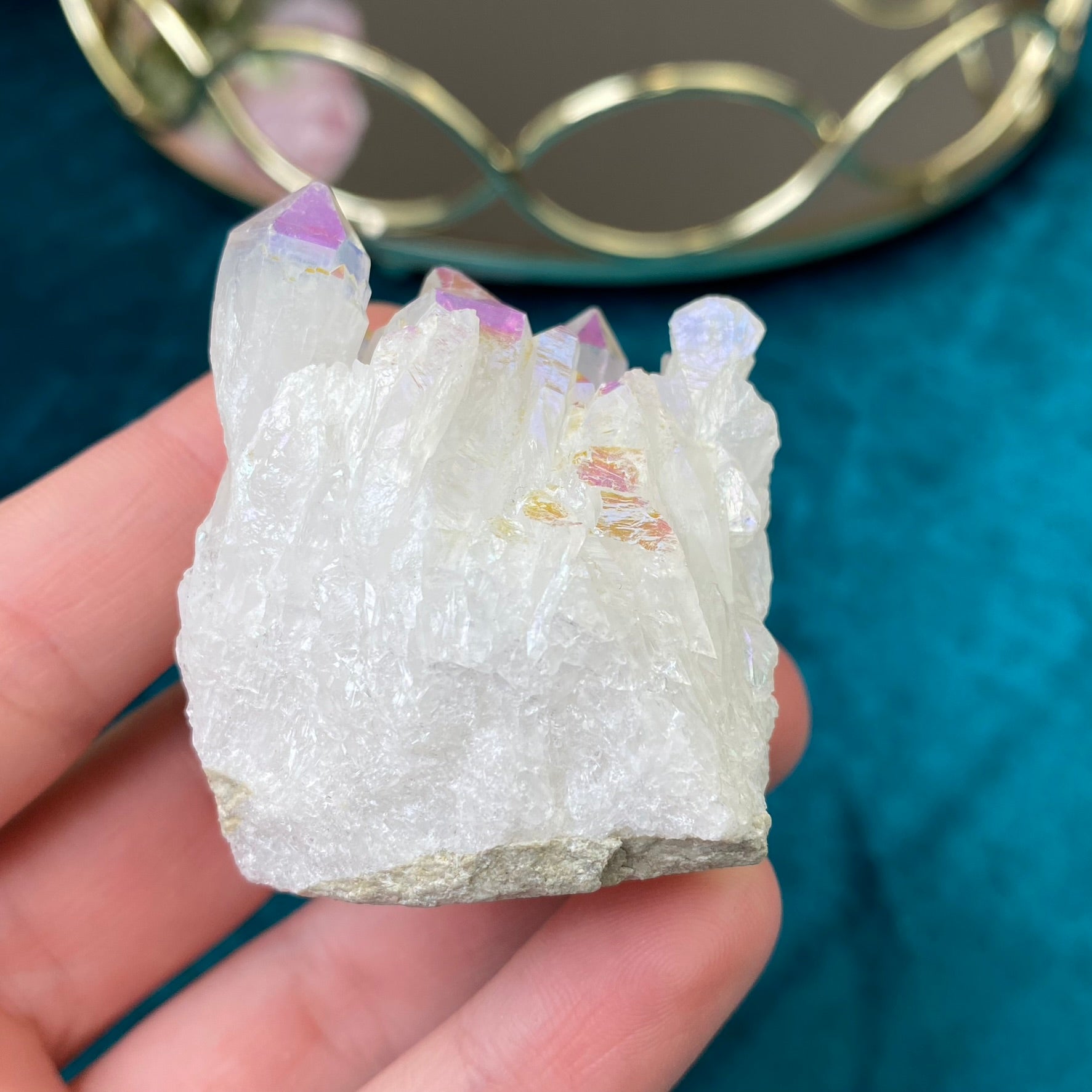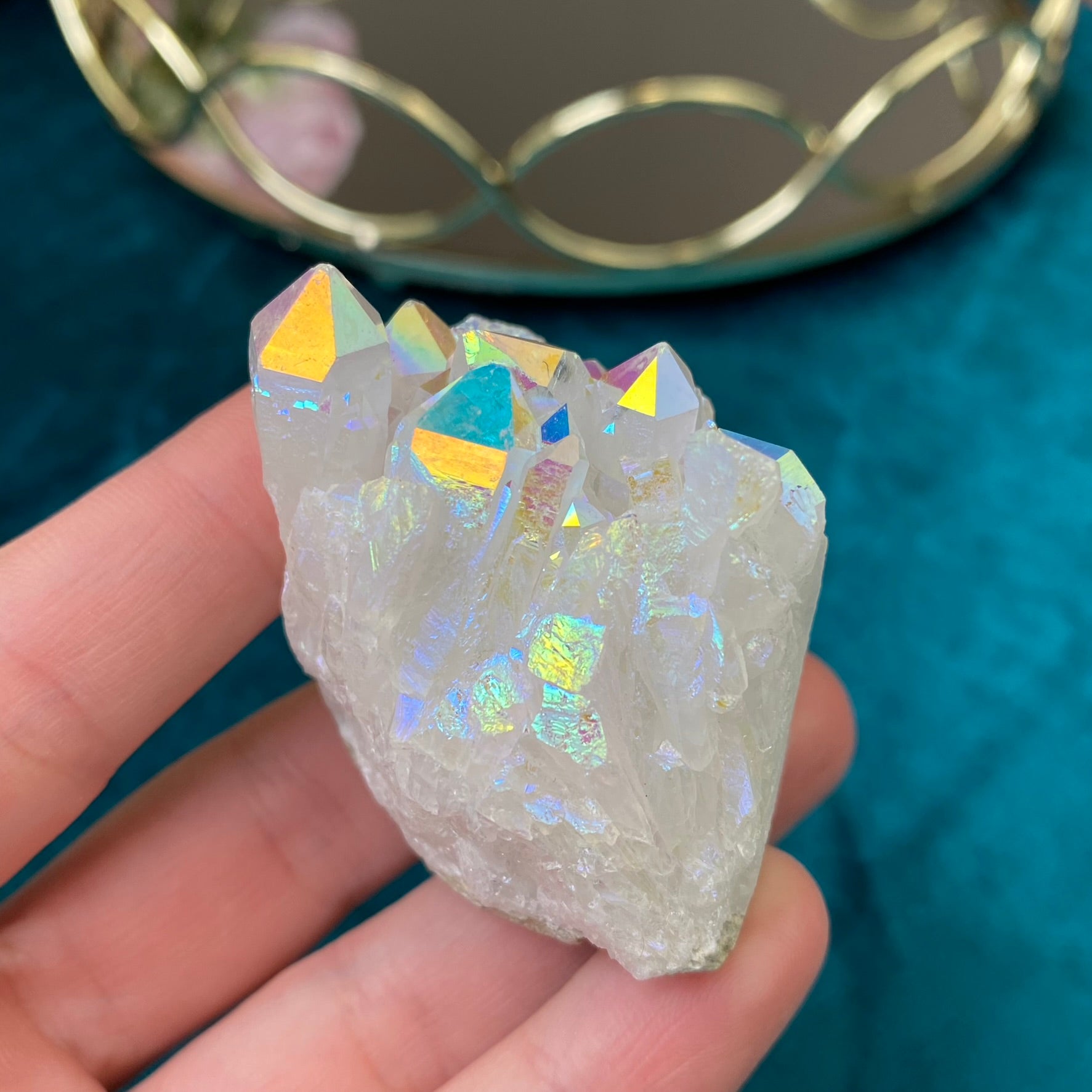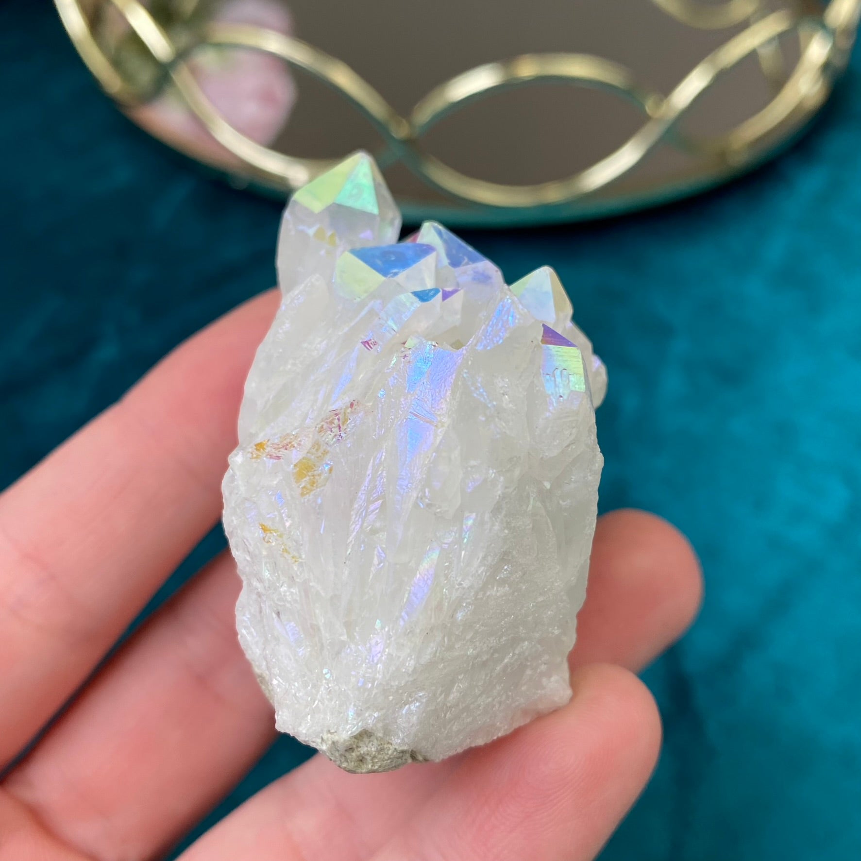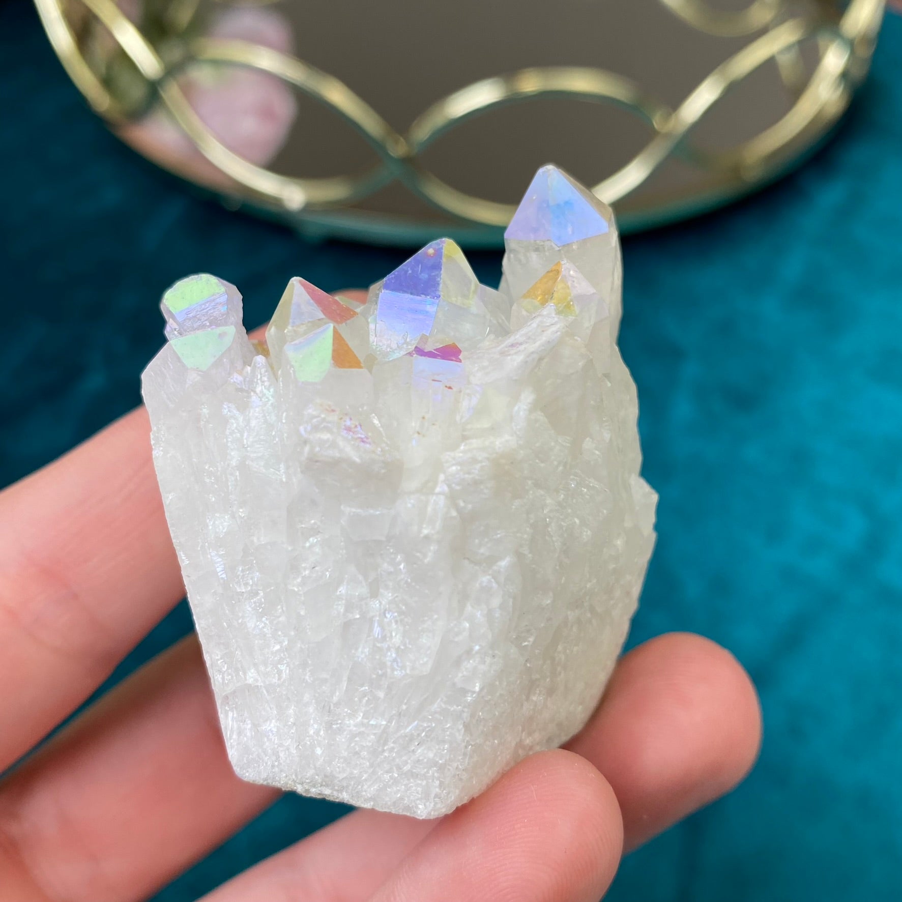 AURA QUARTZ- is a natural transparent Quartz, which gets its brilliant color from heating. A quartz crystal is placed in a heated vacuum chamber and vaporized metal is then supplied to the chamber, which deposits on the surface of the crystal creating an iridescent metallic luster. The color of Aura Quartz depends on the type of metal used. Aura Quartz activates mental activity, helps organize thoughts and focus on something important, especially good talisman for pupils and students. Aura Quartz accumulates sufficient energy, brings good luck and attracts material well-being. It, protects the house and family from evil. Healing properties - it helps in thyroid, skin, lung, arthritis, eye, throat and sea diseases.