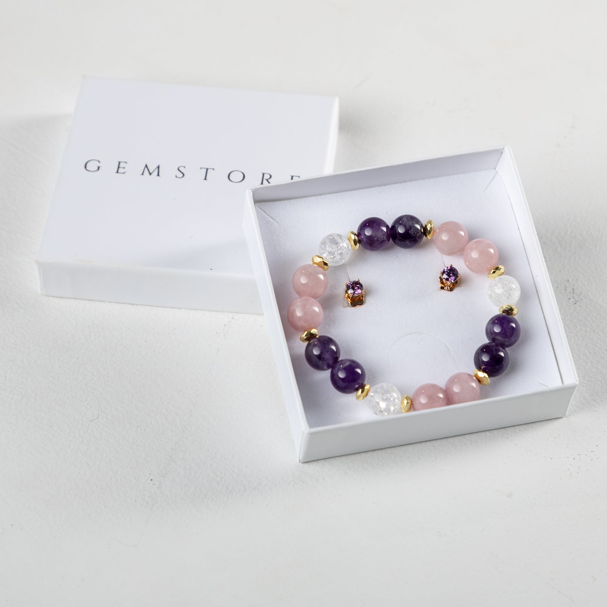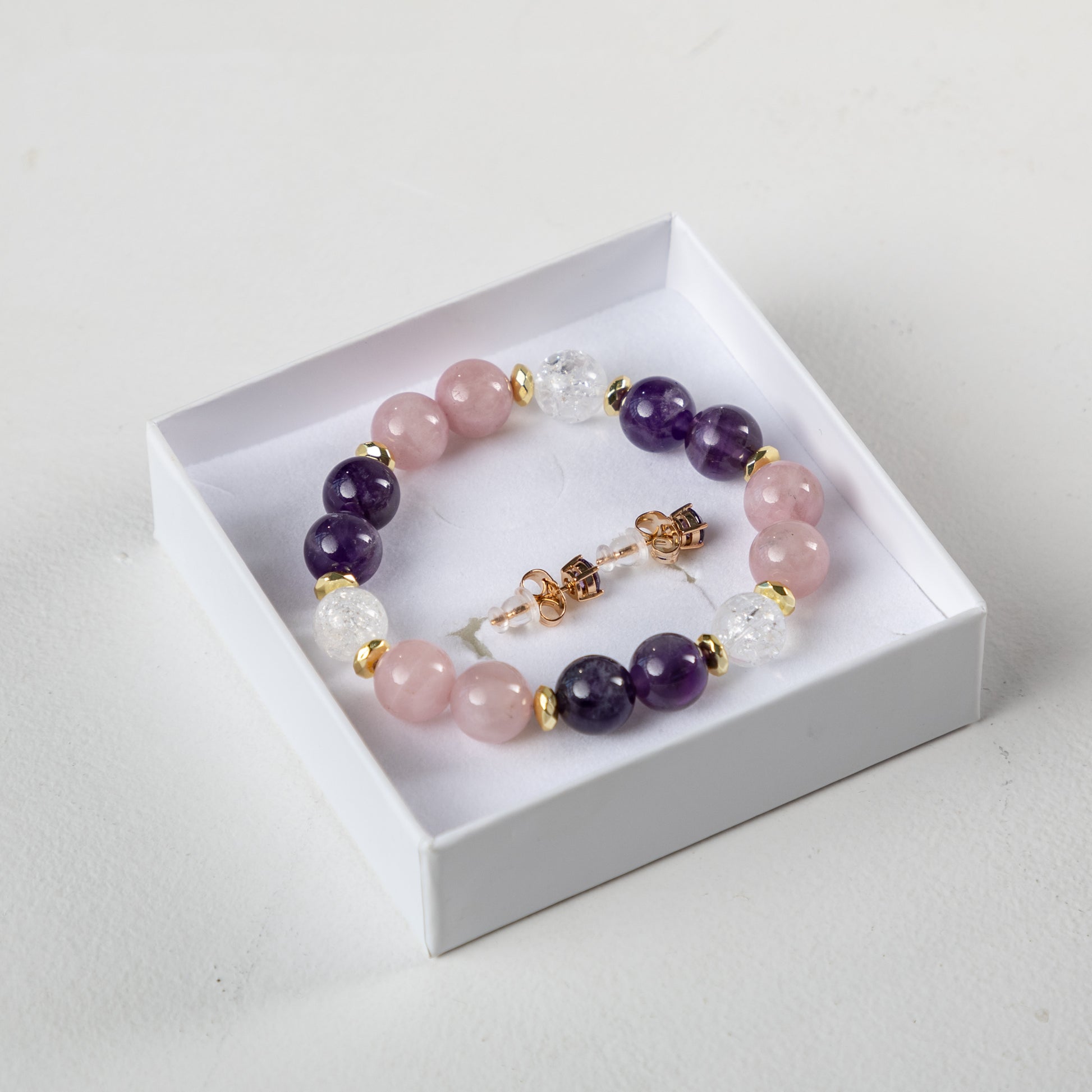 Madagascar Rose Quartz with Amethyst and Clear Quartz bracelet set with decorative crystals earrings