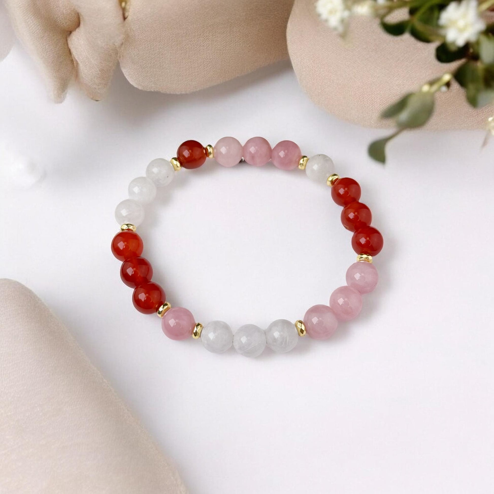 Madagaskaras Rozā Kvarca, Mēnessakmens un Karneola aproce ( Rozā Kvarcs, Mēnessakmens, Karneols (Serdoliks) 8mm)