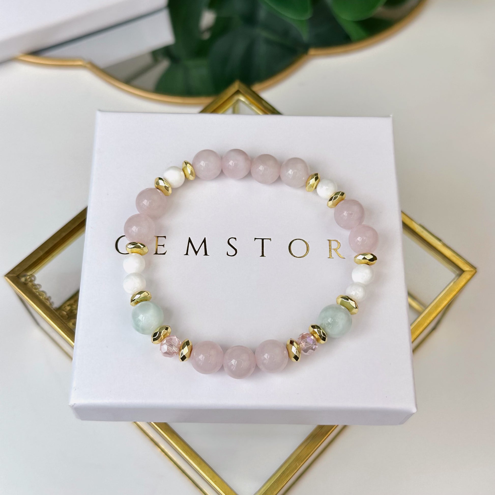 Rozā Kvarca, Angelīta un Perlamutra rokassprādze (Rozā Kvarcs, Angelīts, Perlamutrs, 8mm. Mīlestībai, pozitīvai enerģijai un labklājībai)