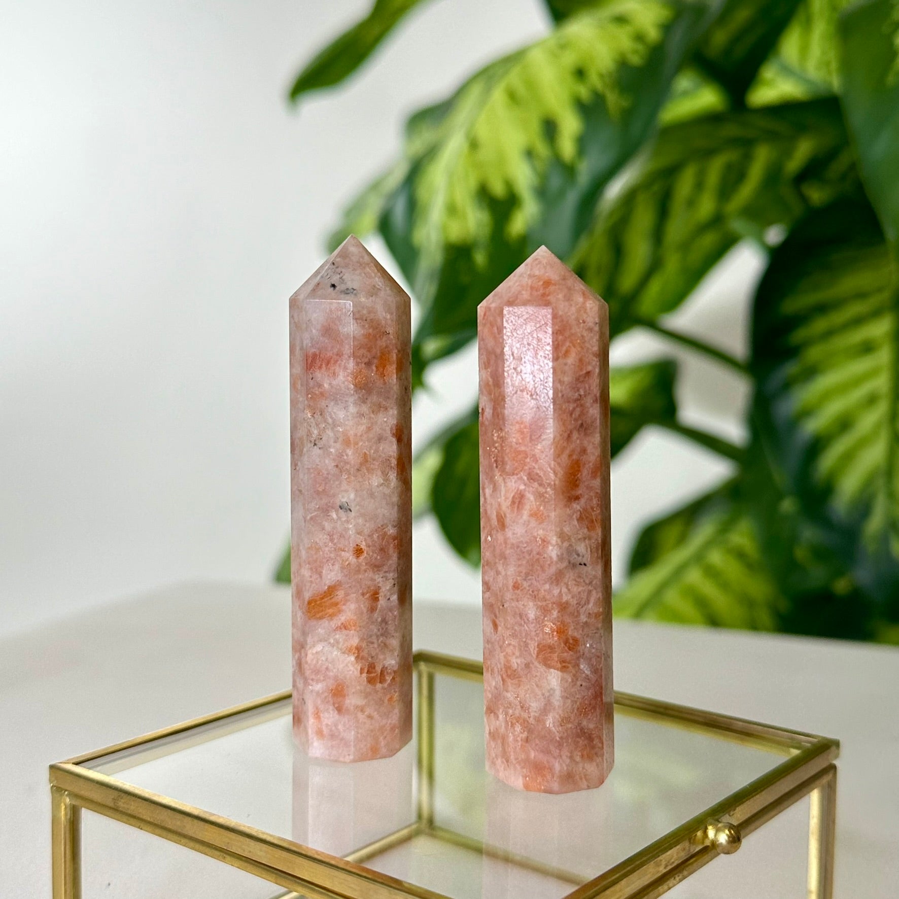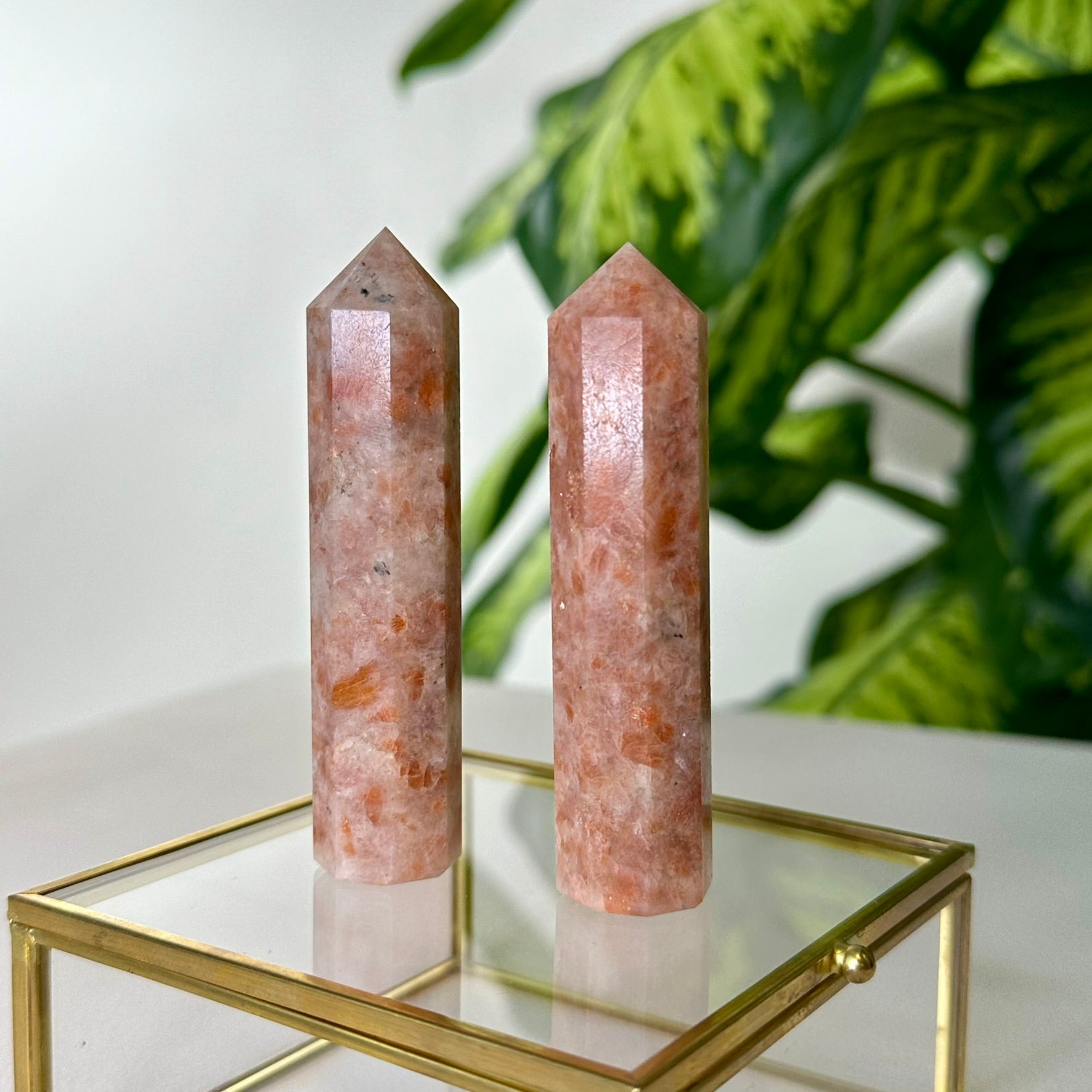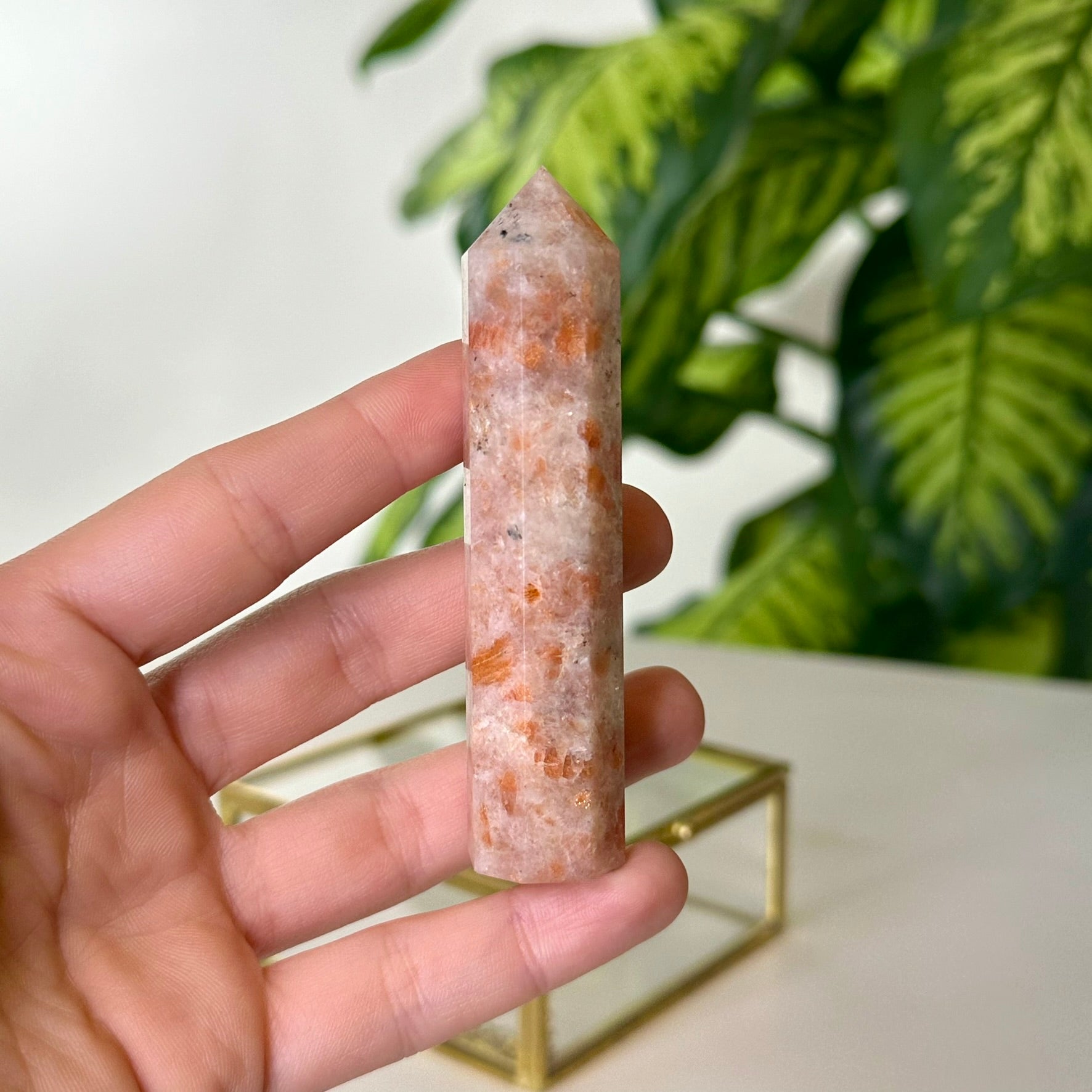 *Tiks nosūtīts 1 gab. Saulesakmens tornis. Aptuvenais augstums ~8.7-9cm. Katrs dabīgais akmens ir unikāls eksemplārs, tādēļ var nedaudz atsķirties no attēlā redzamajiem -krāsa, tekstūra, forma, kristālu skaits u.c.