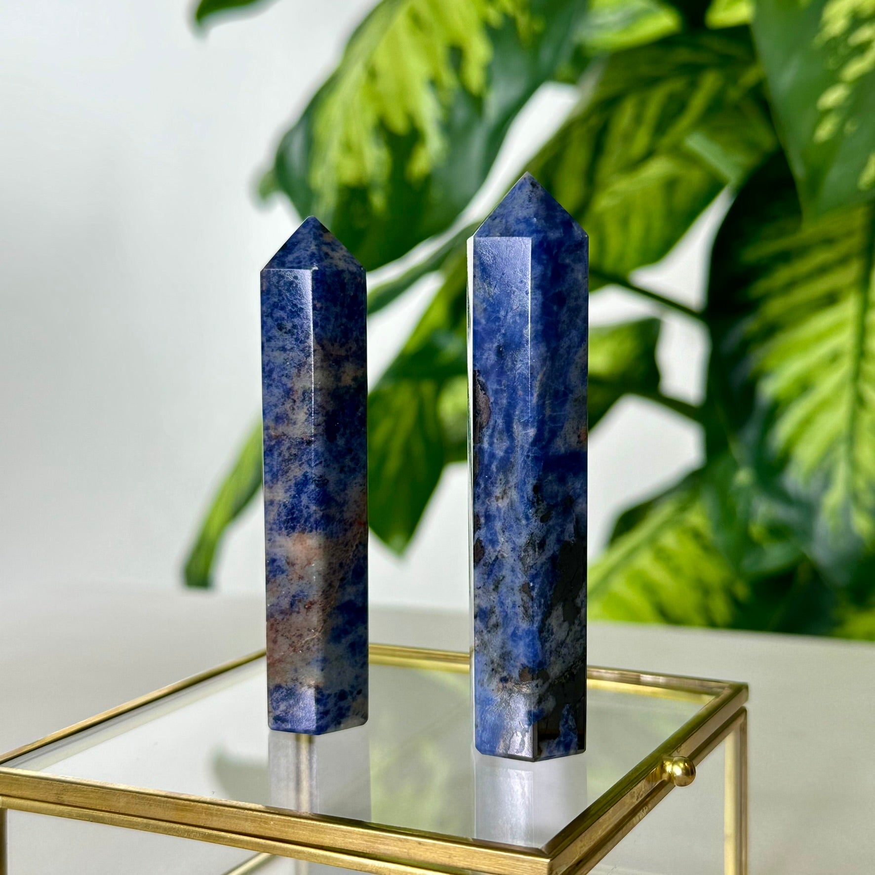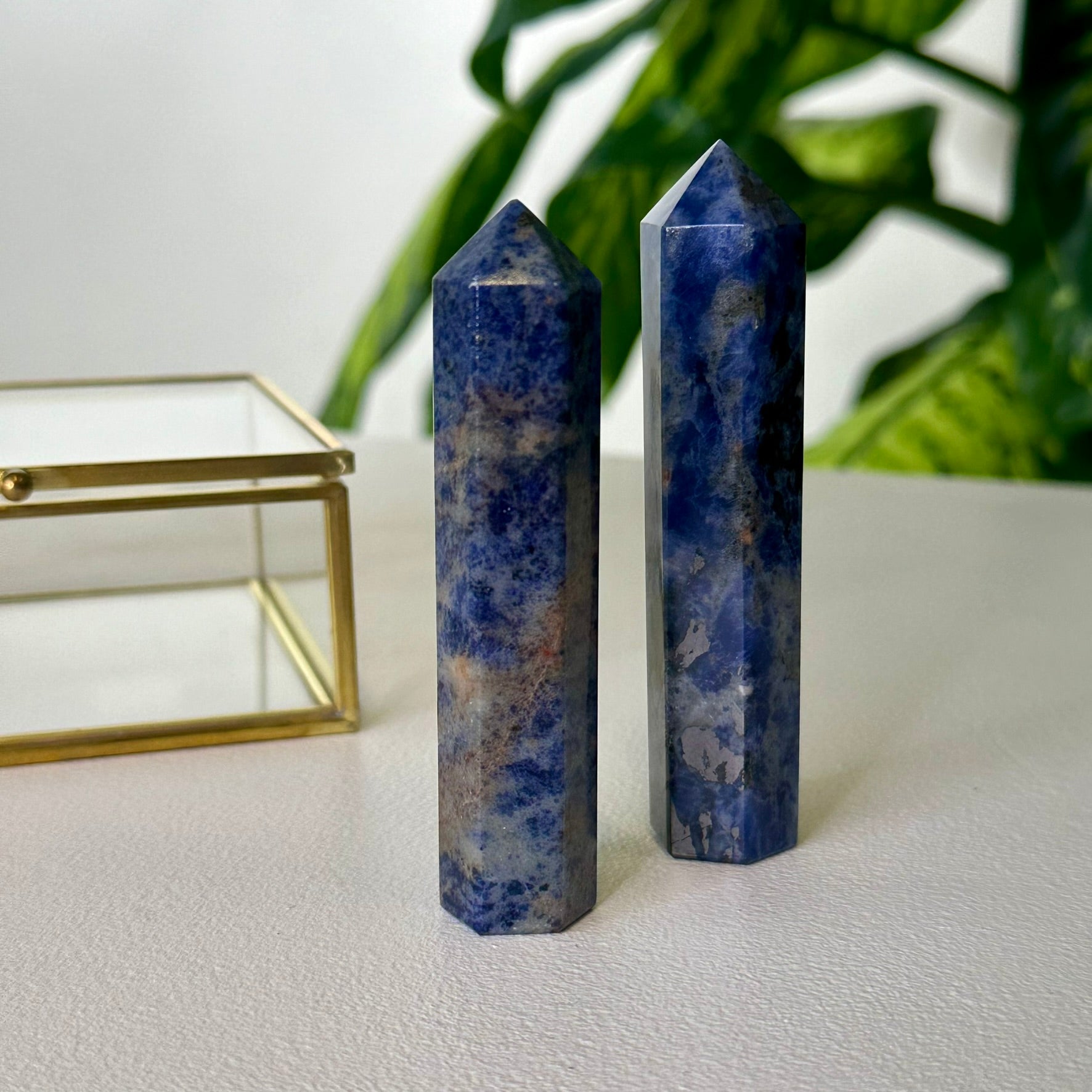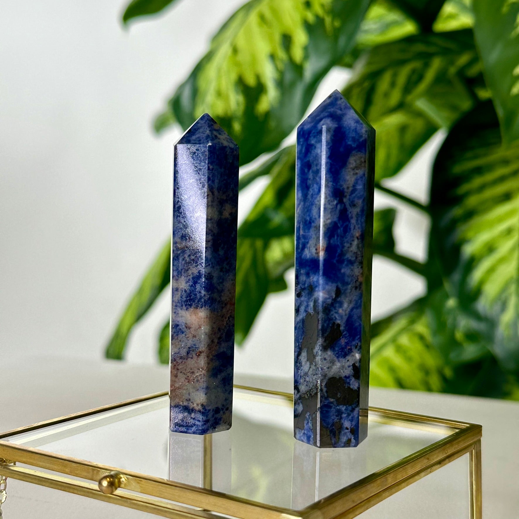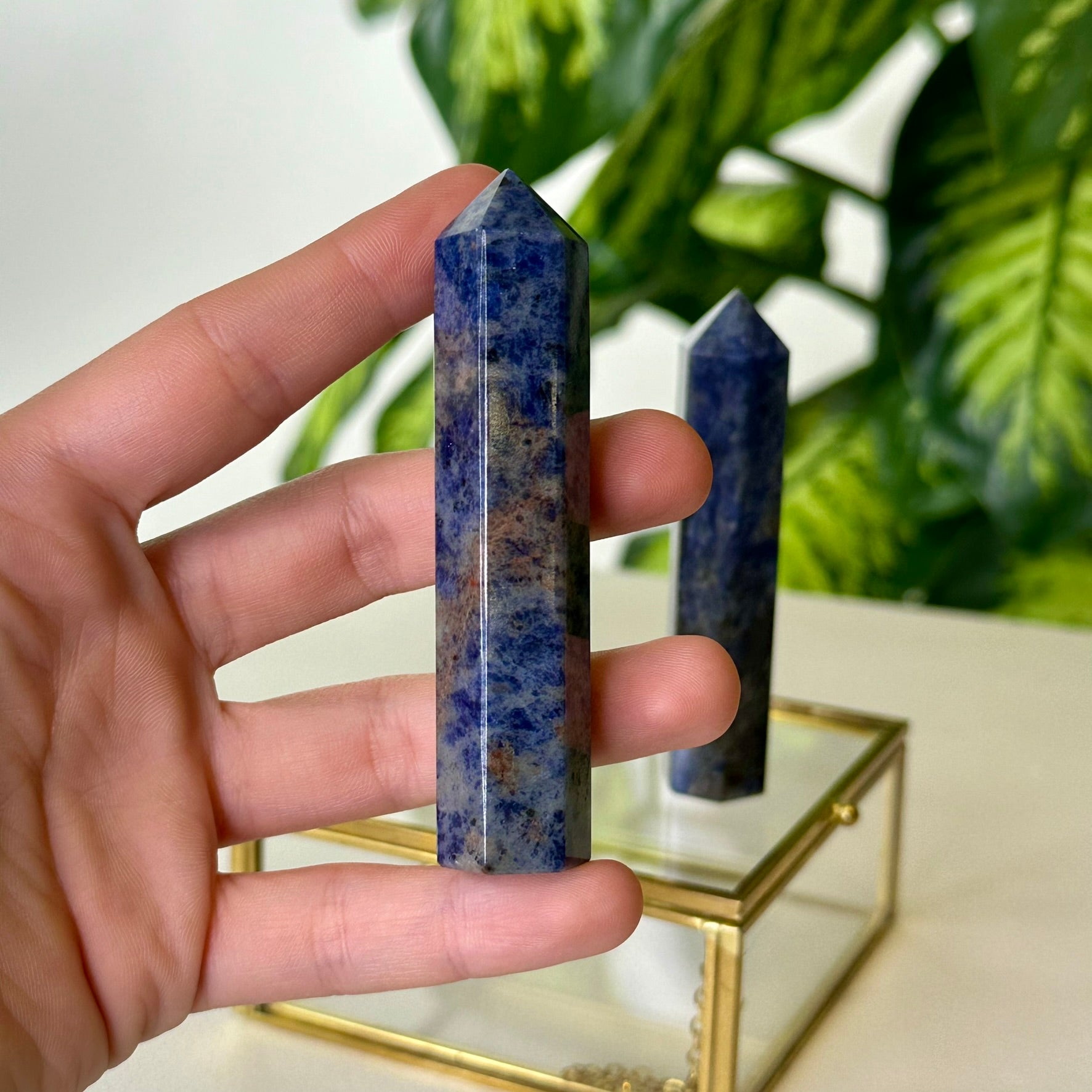 *Tiks nosūtīts 1 gab. Sodalīta tornis. Aptuvenais augstums ~8.8-9.2cm. Katrs dabīgais akmens ir unikāls eksemplārs, tādēļ var nedaudz atsķirties no attēlā redzamajiem -krāsa, tekstūra, forma, kristālu skaits u.c.