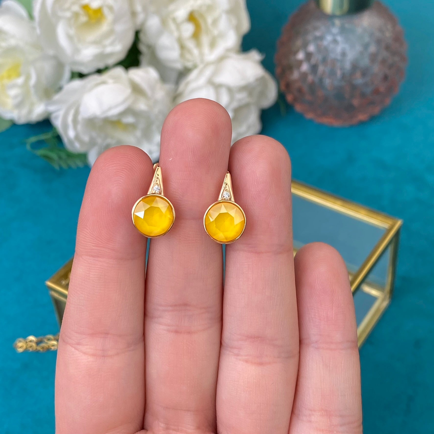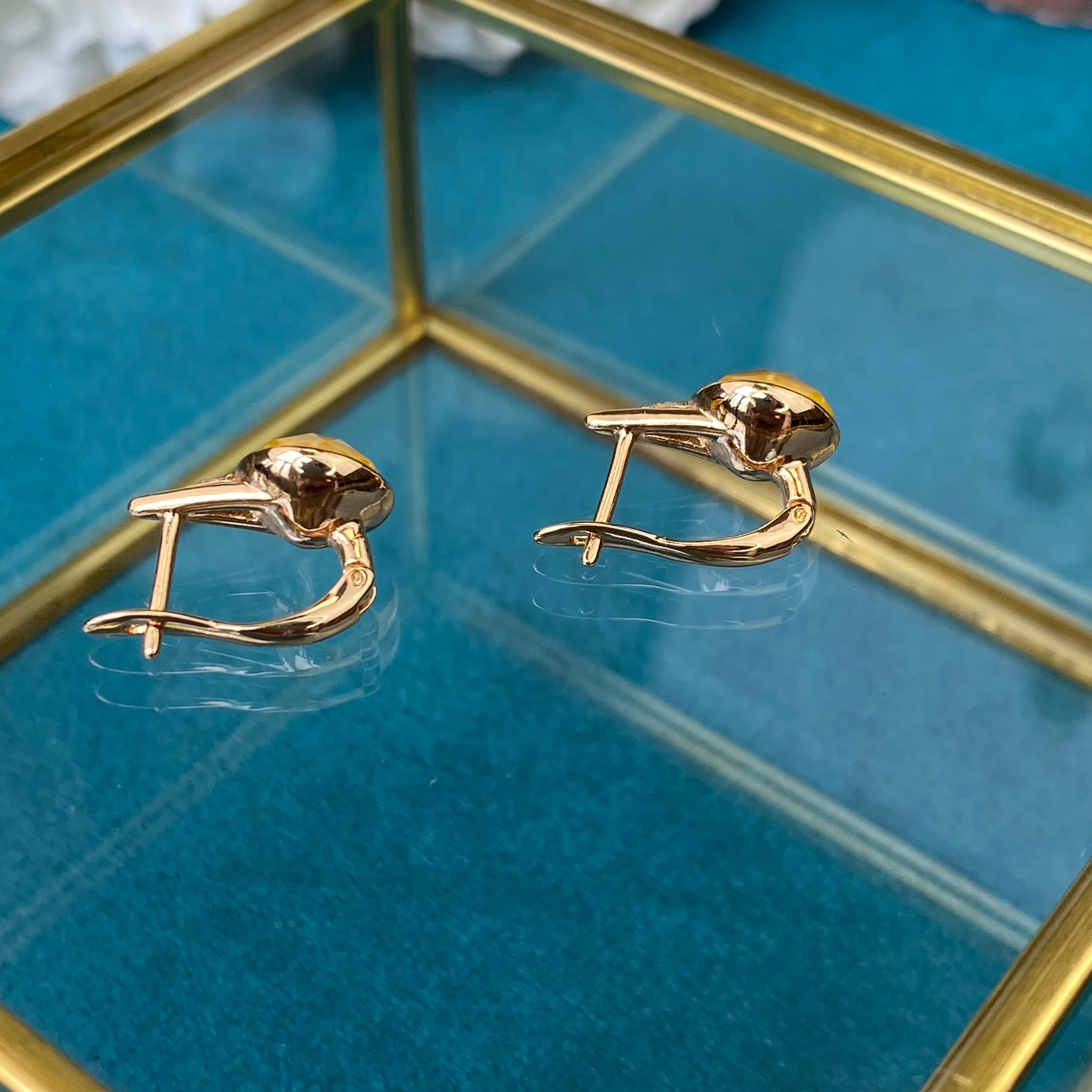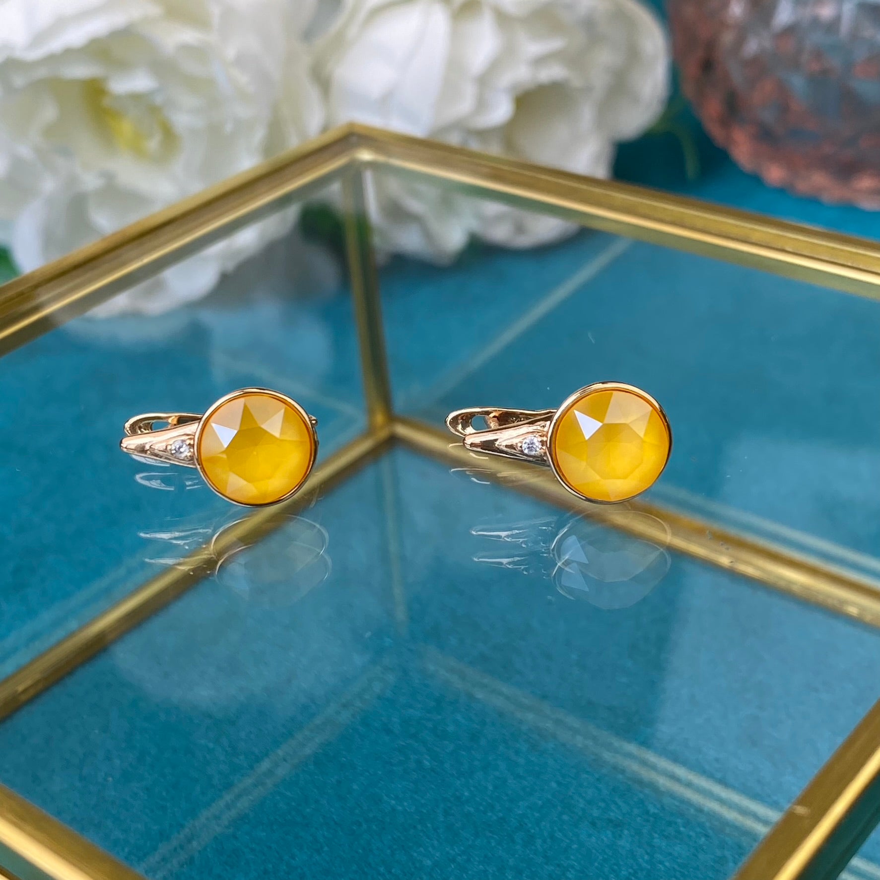 Apzeltīti auskari ar dzeltenu dekoratīvu kristālu