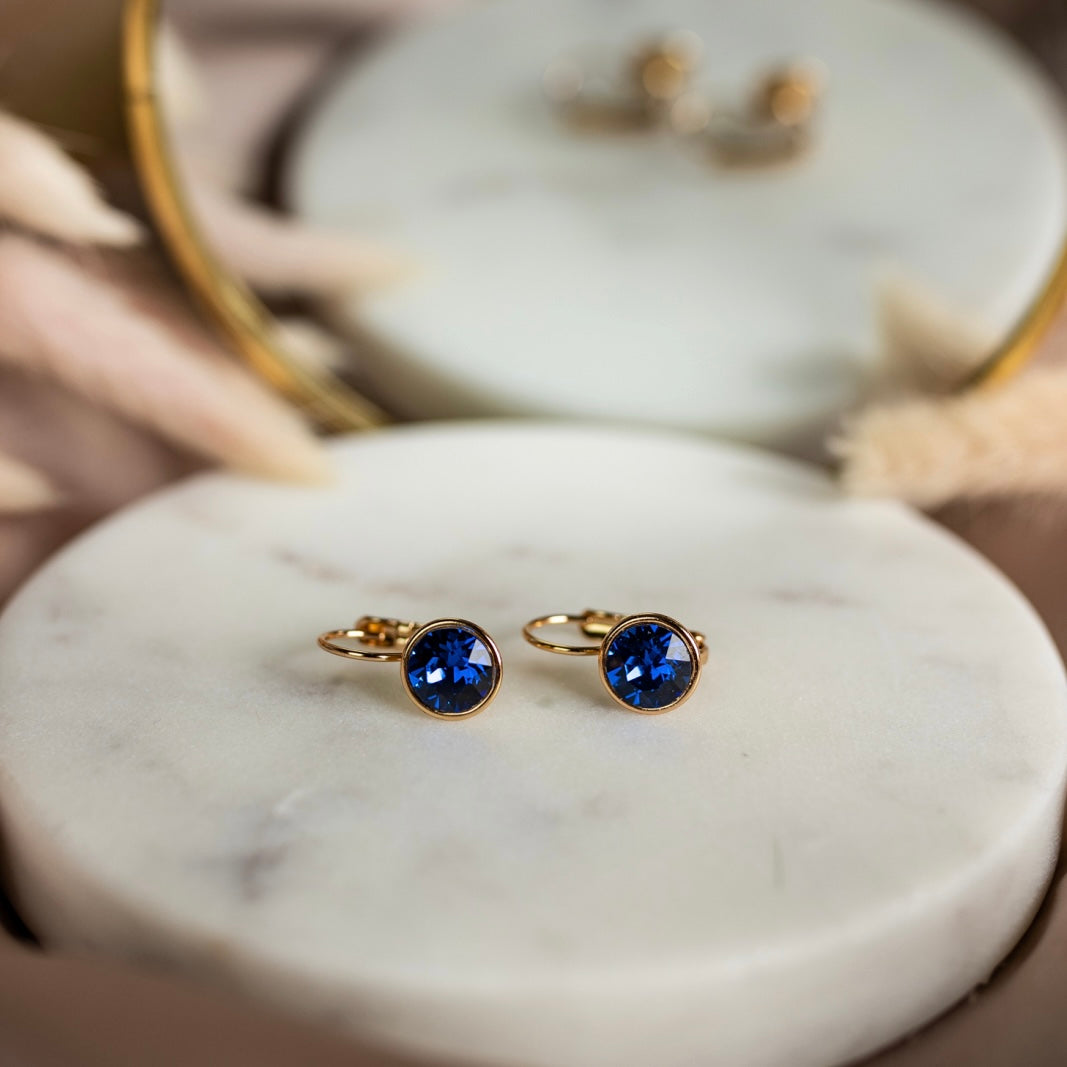 Apzeltīti auskari ar tumši zilu kubisko cirkoniju