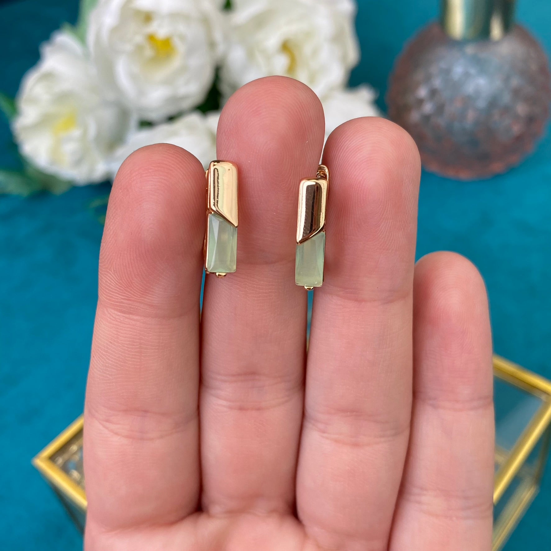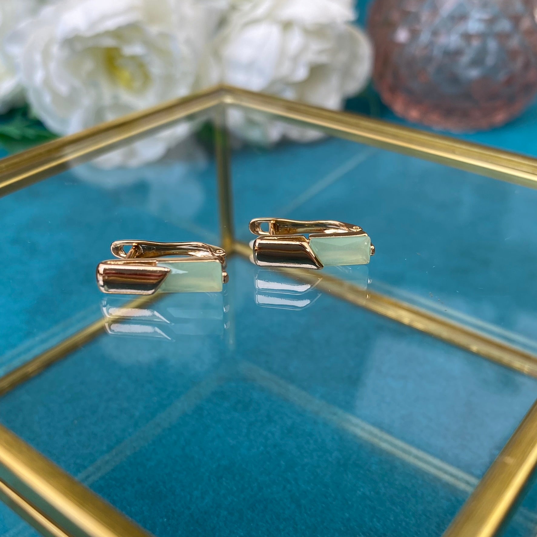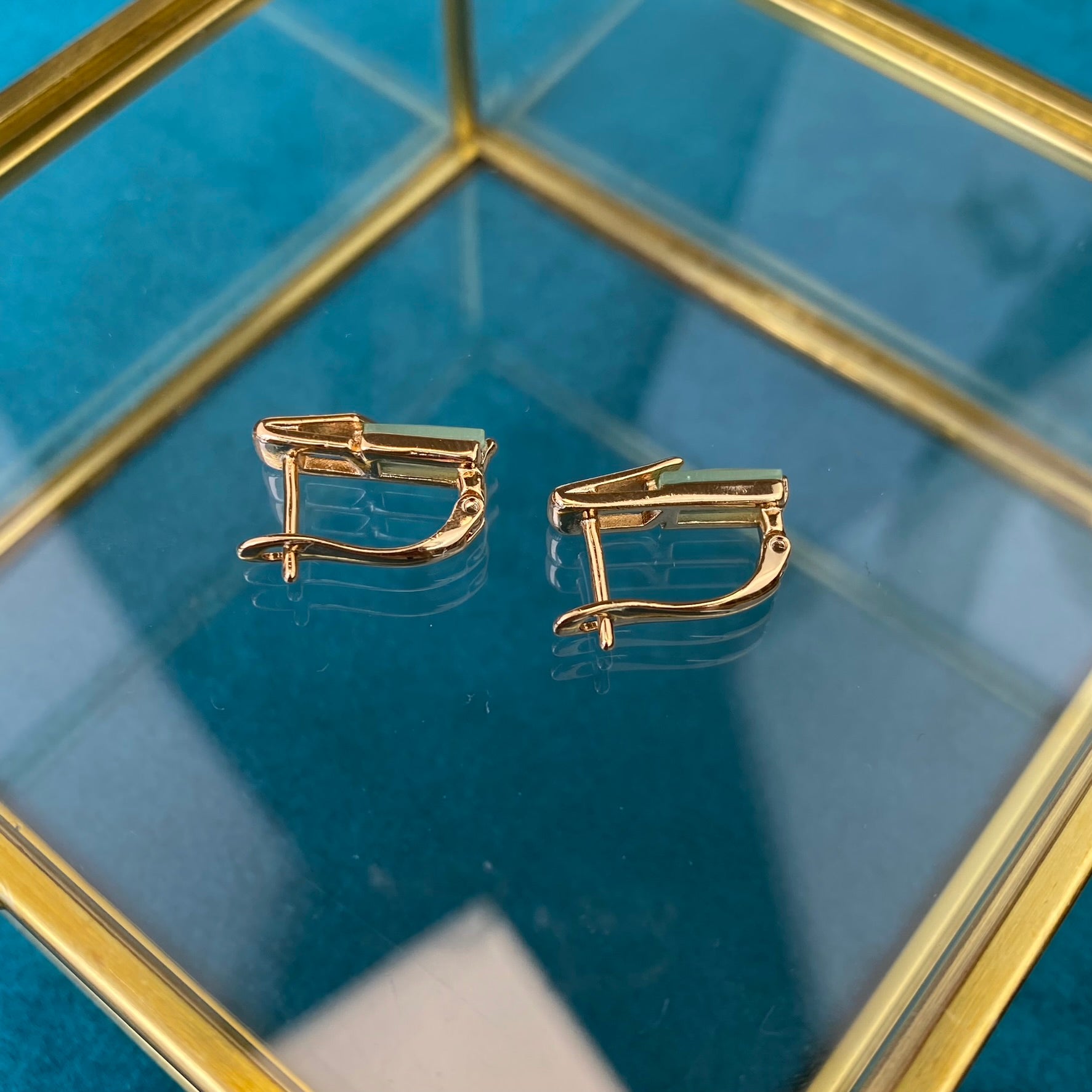 Apzeltīti auskari ar zaļu dekoratīvu kristālu