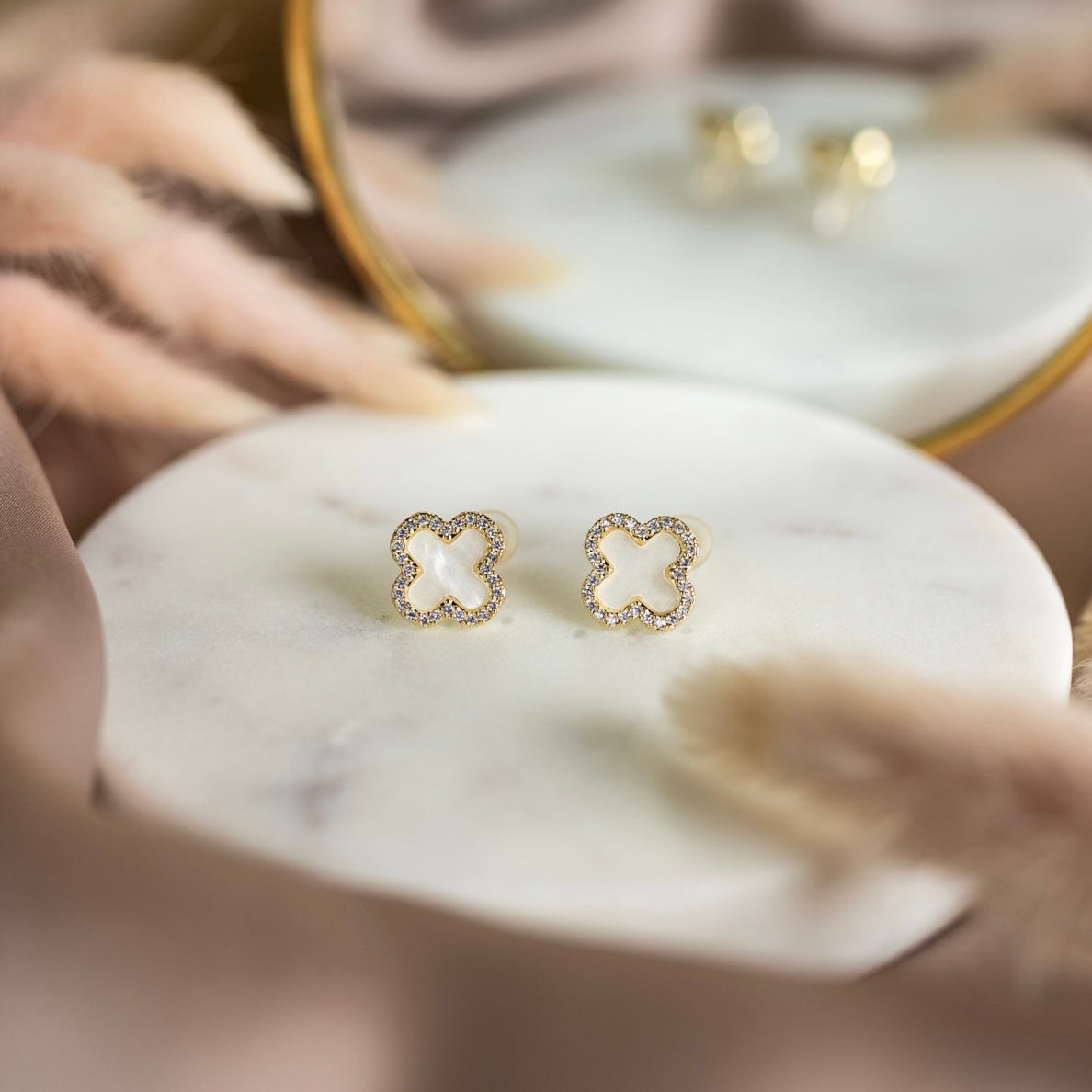 Apzeltīti CLOVER auskari perlamutra krāsā