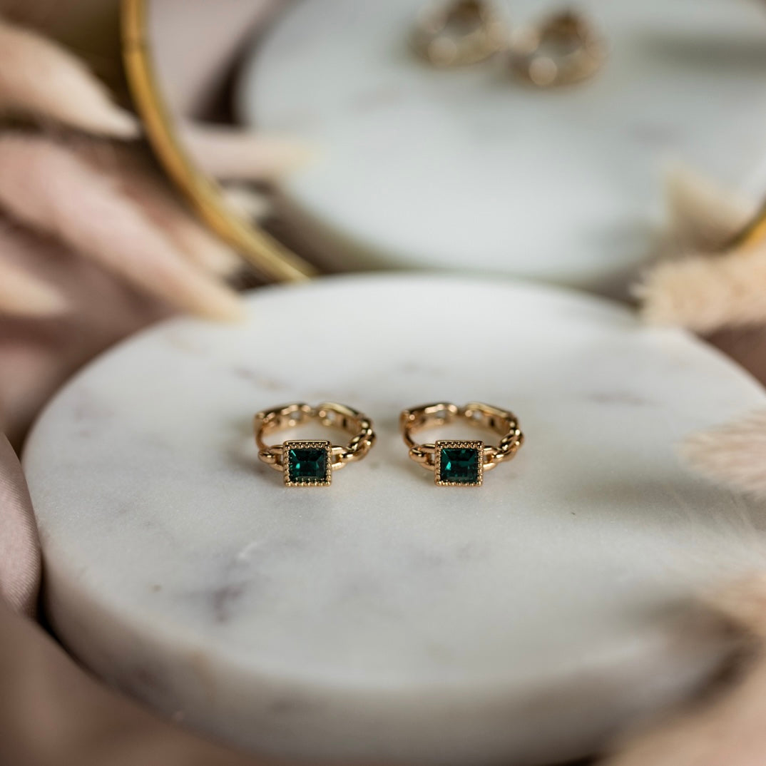 Apzeltīti pīti riņķīši "Charm"ar zaļu kristālu