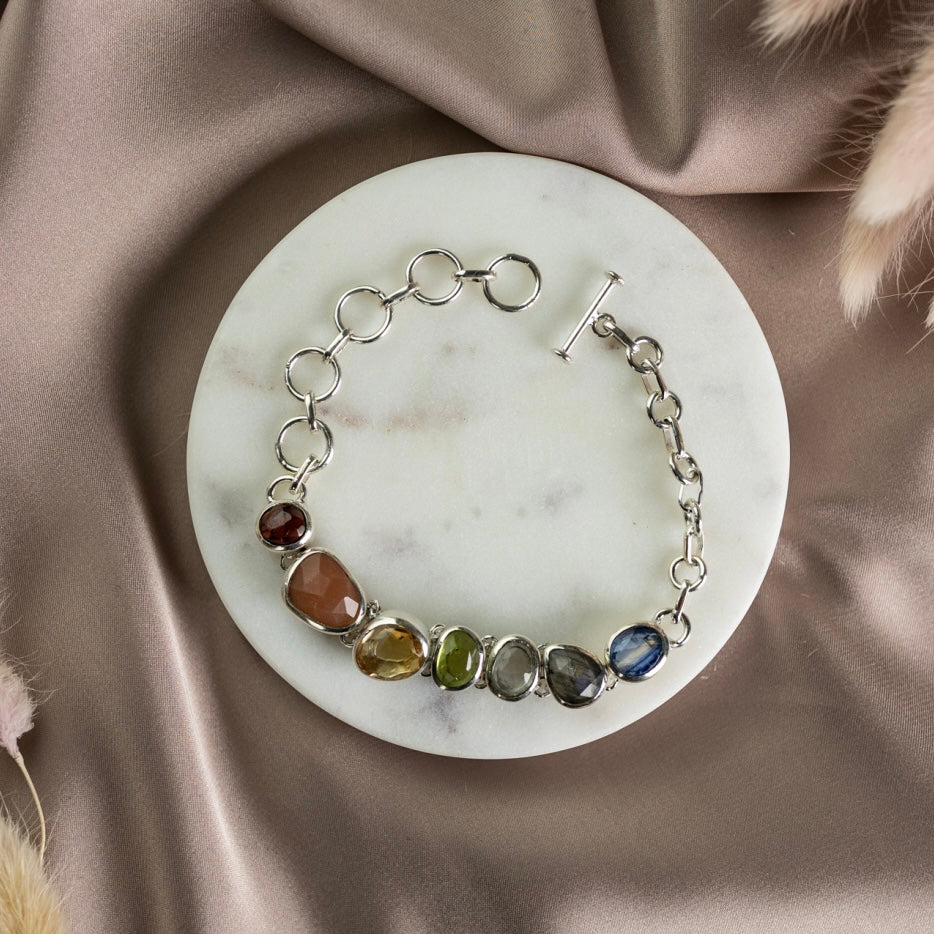 Dabīgo akmeņu sudraba rokassprādze (Kianīts, Labradorīts, Topāzs, Peridots, Citrīns,Saulesakmens, Granāts, 925 proves sudrabs, 15.5+4cm)