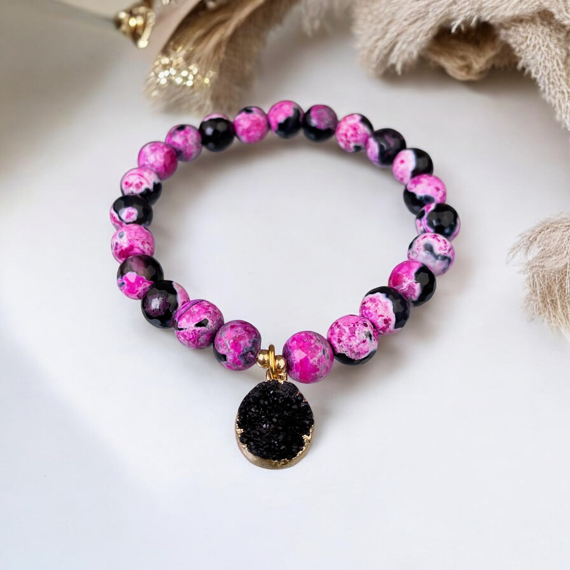 Uguns Ahāta rokassprādze ar Kvarca drūzas piekariņu (Ahāts tonēts , slīpēta forma, 8mm)