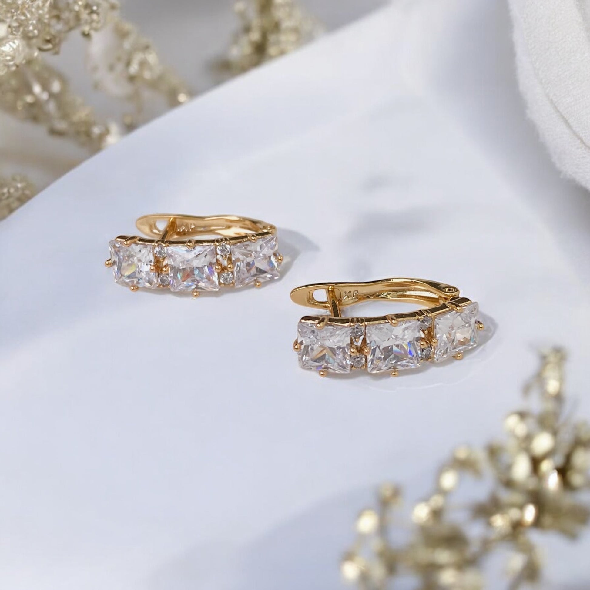 Apzeltīti auskari ar baltiem dekoratīviem kristāliem