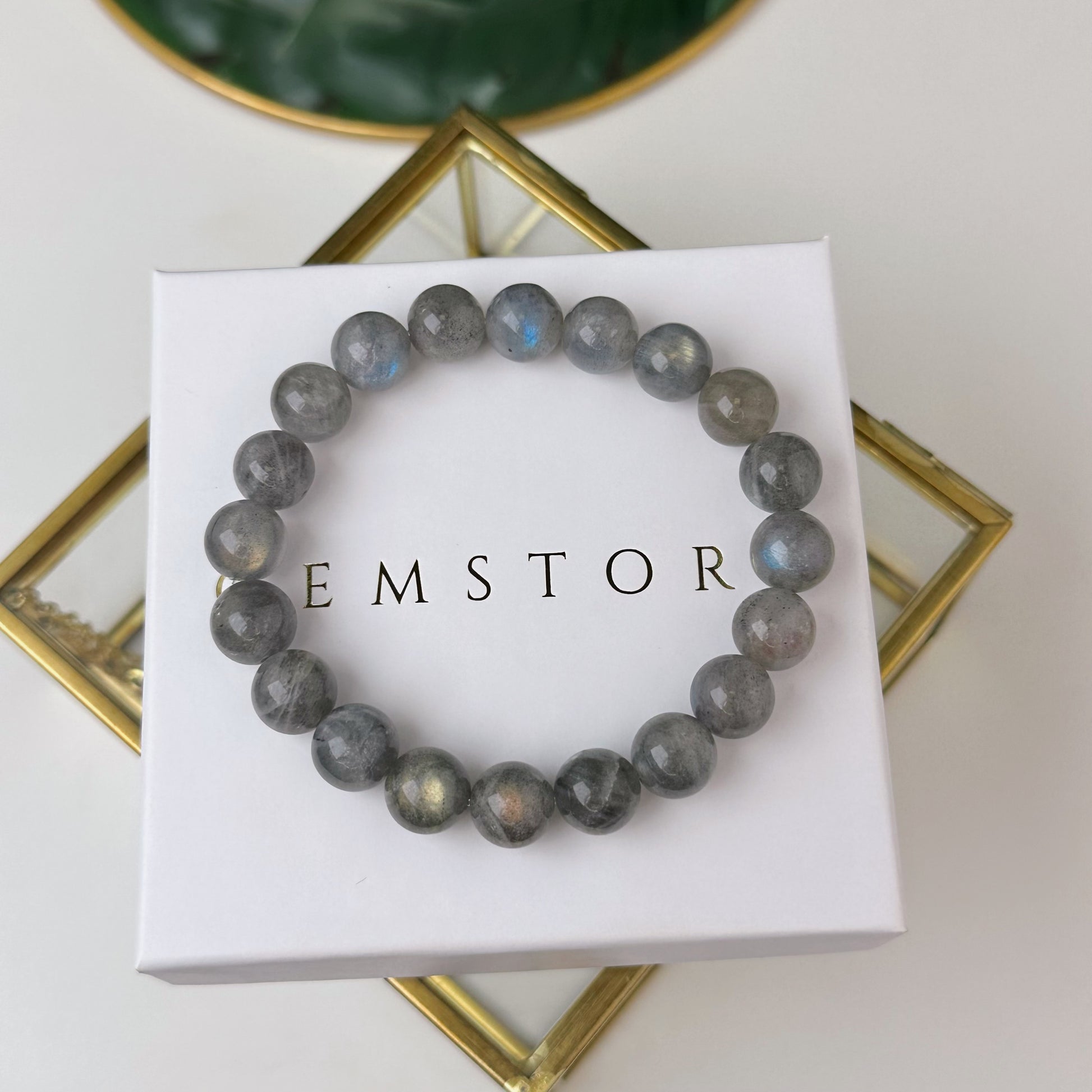Labradorīts ir īpaši skaists un noslēpumains akmens, kam piemīt unikāls optiskais efekts – labradorescence. Tas ir daudzkrāsains gaismas mirdzums, kas rotaļājas uz akmens virsmas. Šajā aprocē labradorīts izstaro zilu, zaļu un oranžu spīdumu, kas mainās līdz ar gaismas leņķi, radot dzīvu un neatkārtojamu vizuālo efektu. Labradorīts tiek uzskatīts arī par intuīcijas un iekšējā spēka akmeni, kas piešķir rotai ne vien skaistumu, bet arī īpašu nozīmi.