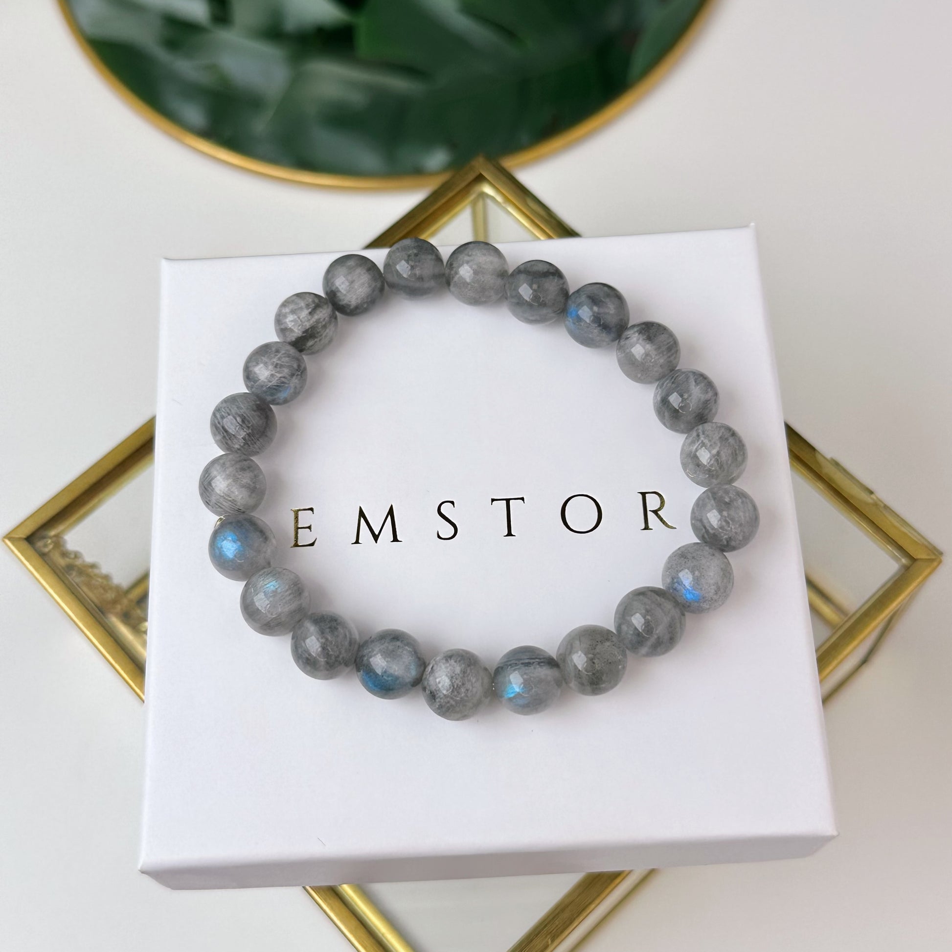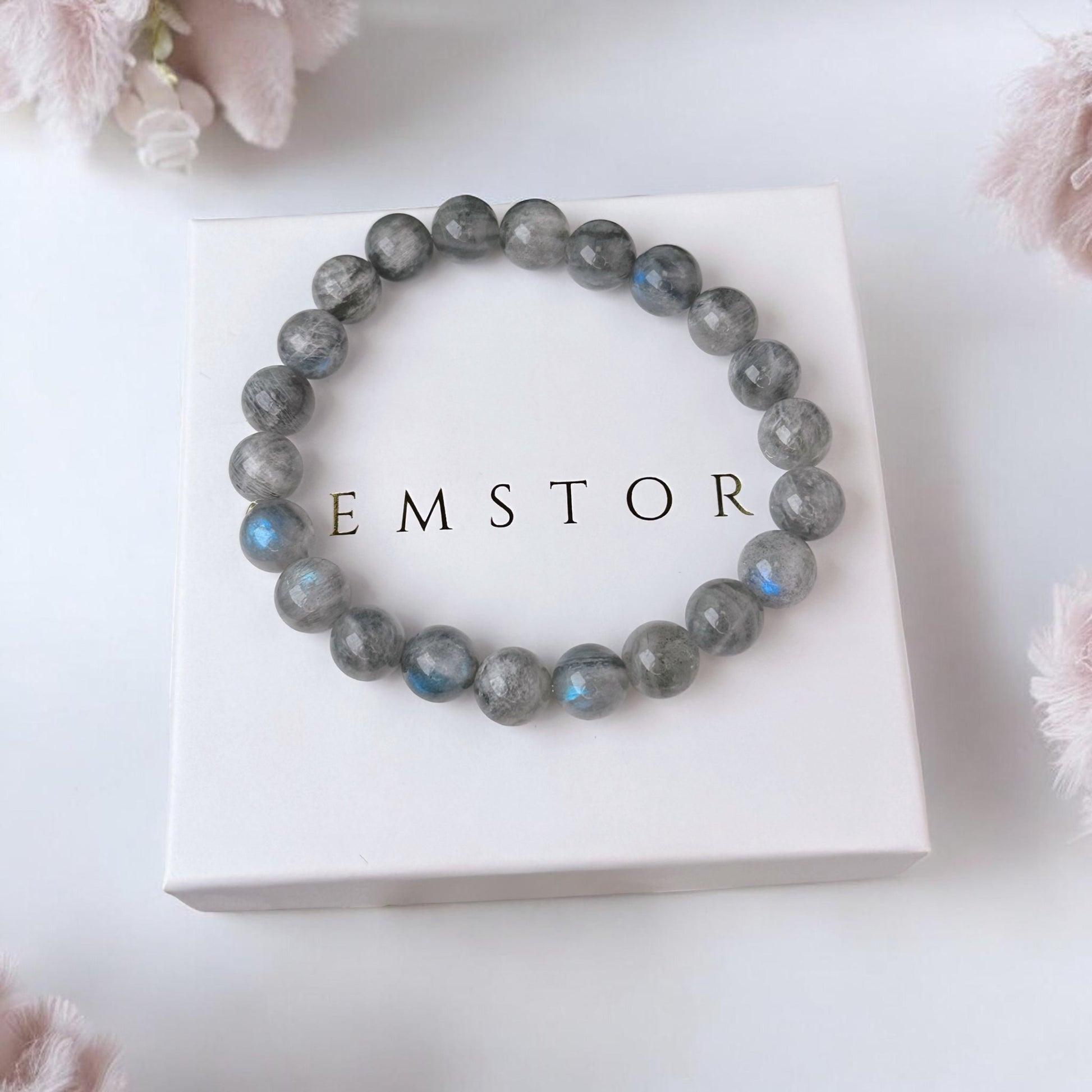 Labradorīts ir īpaši skaists un noslēpumains akmens, kam piemīt unikāls optiskais efekts – labradorescence. Tas ir daudzkrāsains gaismas mirdzums, kas rotaļājas uz akmens virsmas. Šajā aprocē labradorīts izstaro zilu spīdumu.
