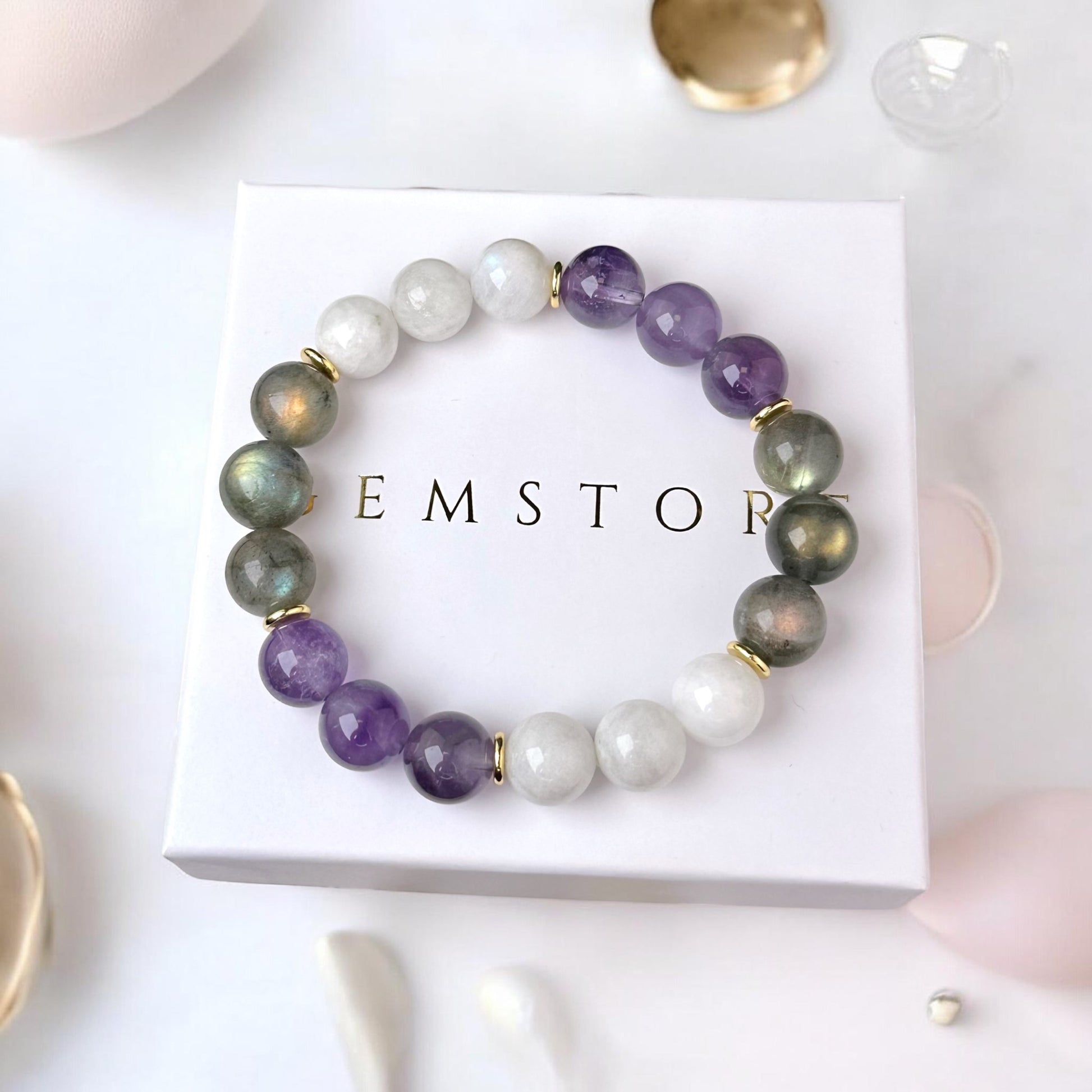 Labradorīta, Mēnessakmens un Ametista aproce ( Labradorīts, Mēnessakmens, Ametists 10mm)