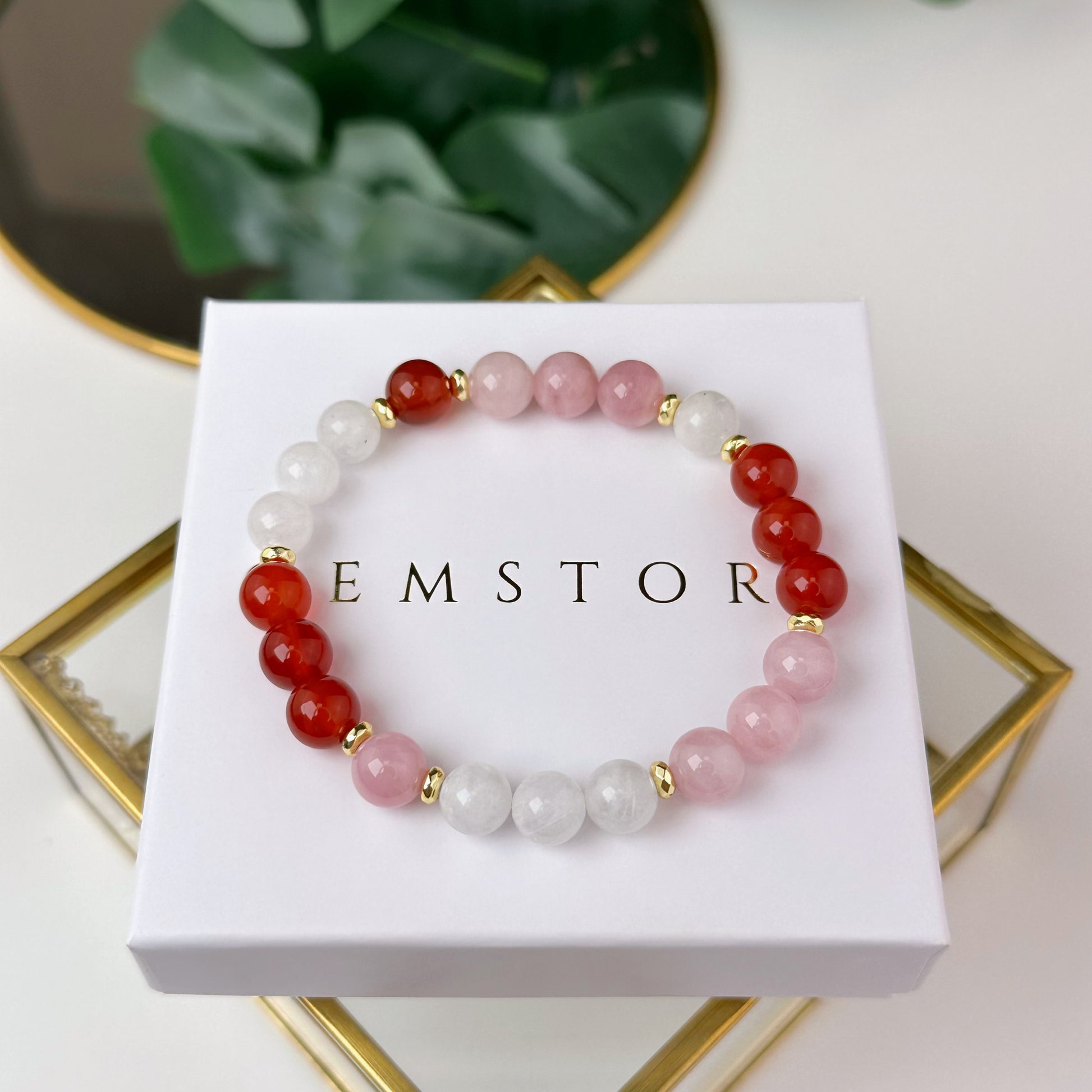 Madagaskaras Rozā Kvarca, Mēnessakmens un Karneola aproce ( Rozā Kvarcs, Mēnessakmens, Karneols (Serdoliks) 8mm)