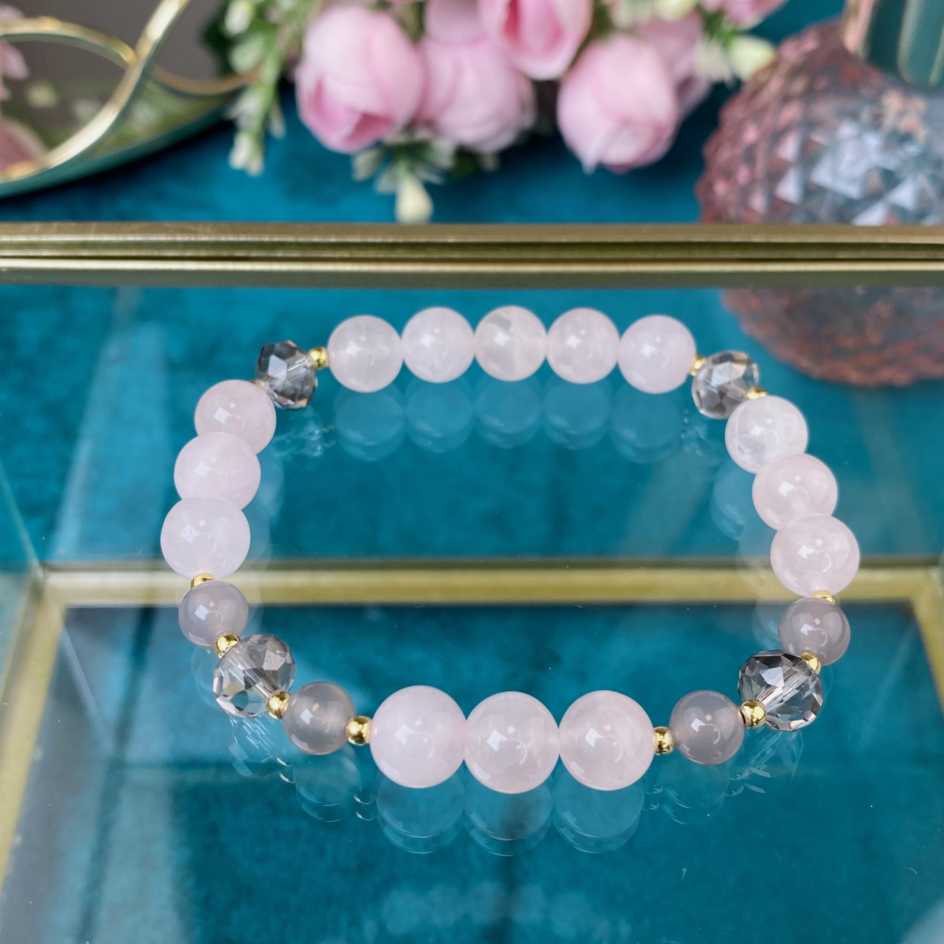 Madagaskaras Rozā Kvarca rokassprādze ar Ahātu (Rozā Kvarcs, Ahāts 8mm. Mīlestībai, skaistumam un veselībai.)
