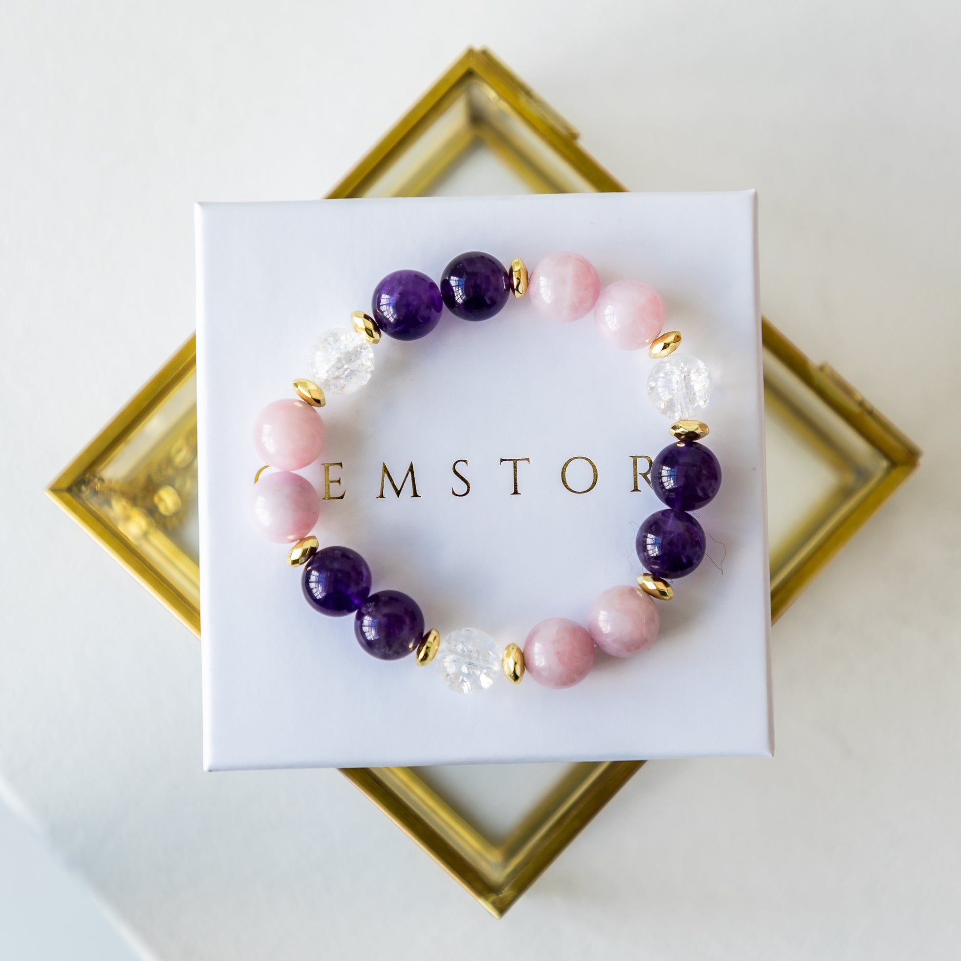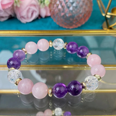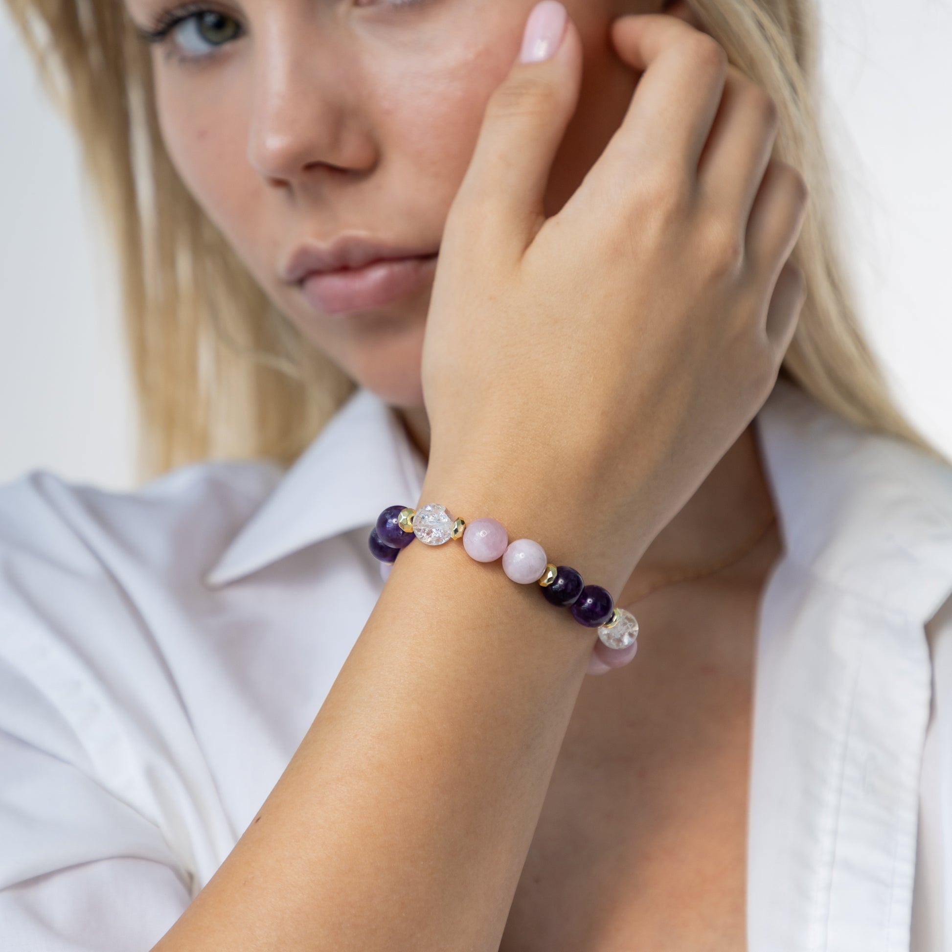 Madagaskaras Rozā Kvarca rokassprādze ar Ametistu un Kalnu Kristālu (Rozā Kvarcs, Ametists, Kalnu Kristāls 10mm. Mīlestībai, harmonijai un veiksmei.)