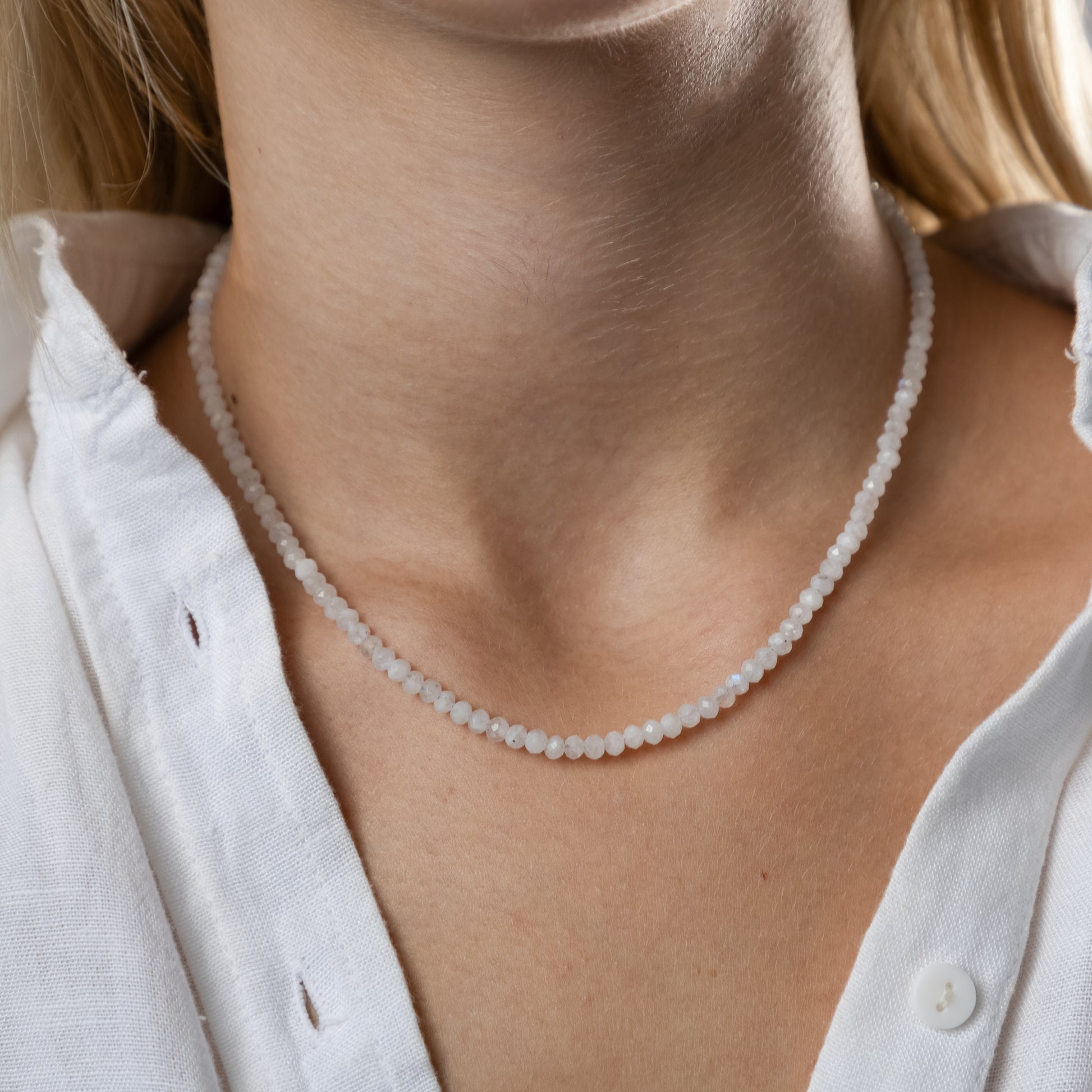 Mēnessakmens kaklarota (Mēnessakmens, slīpēta forma, 4mm, 39cm. Aizdare- Sudrabs 925-apzeltīts.)