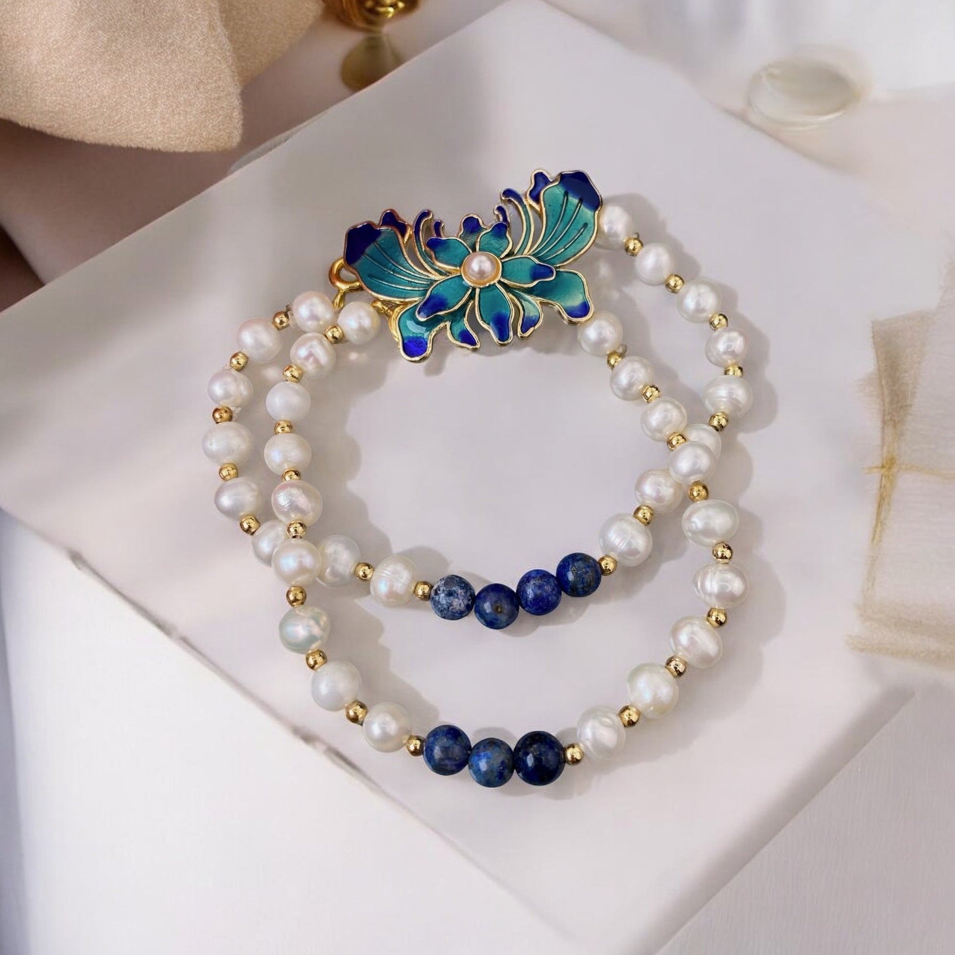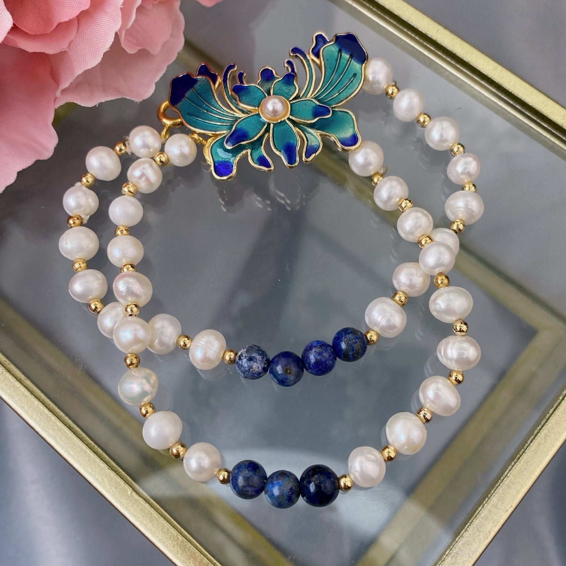 Upes pērļu un Lazurīta rokassprādze, 2 rindās (Lazurīts, Upes pērles)