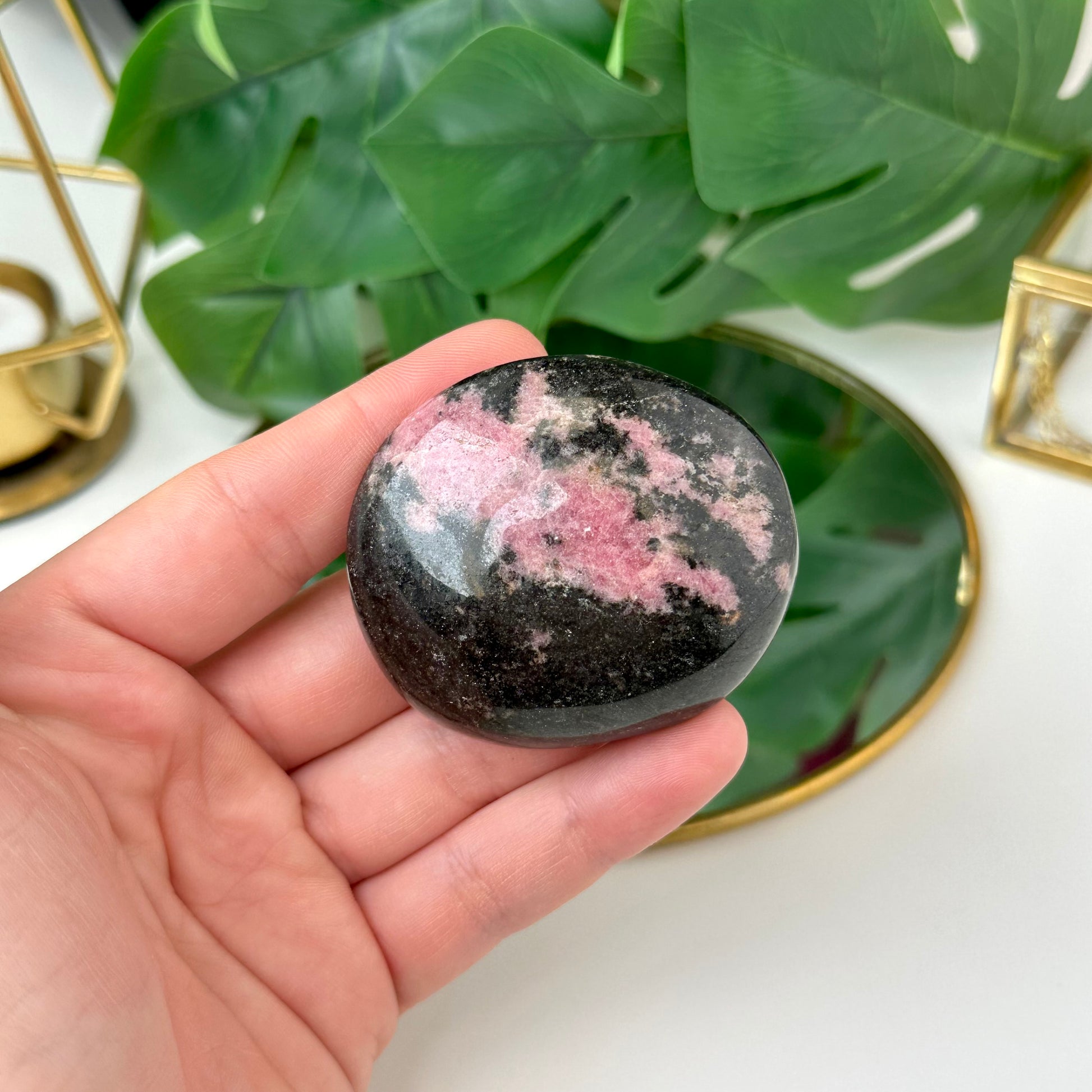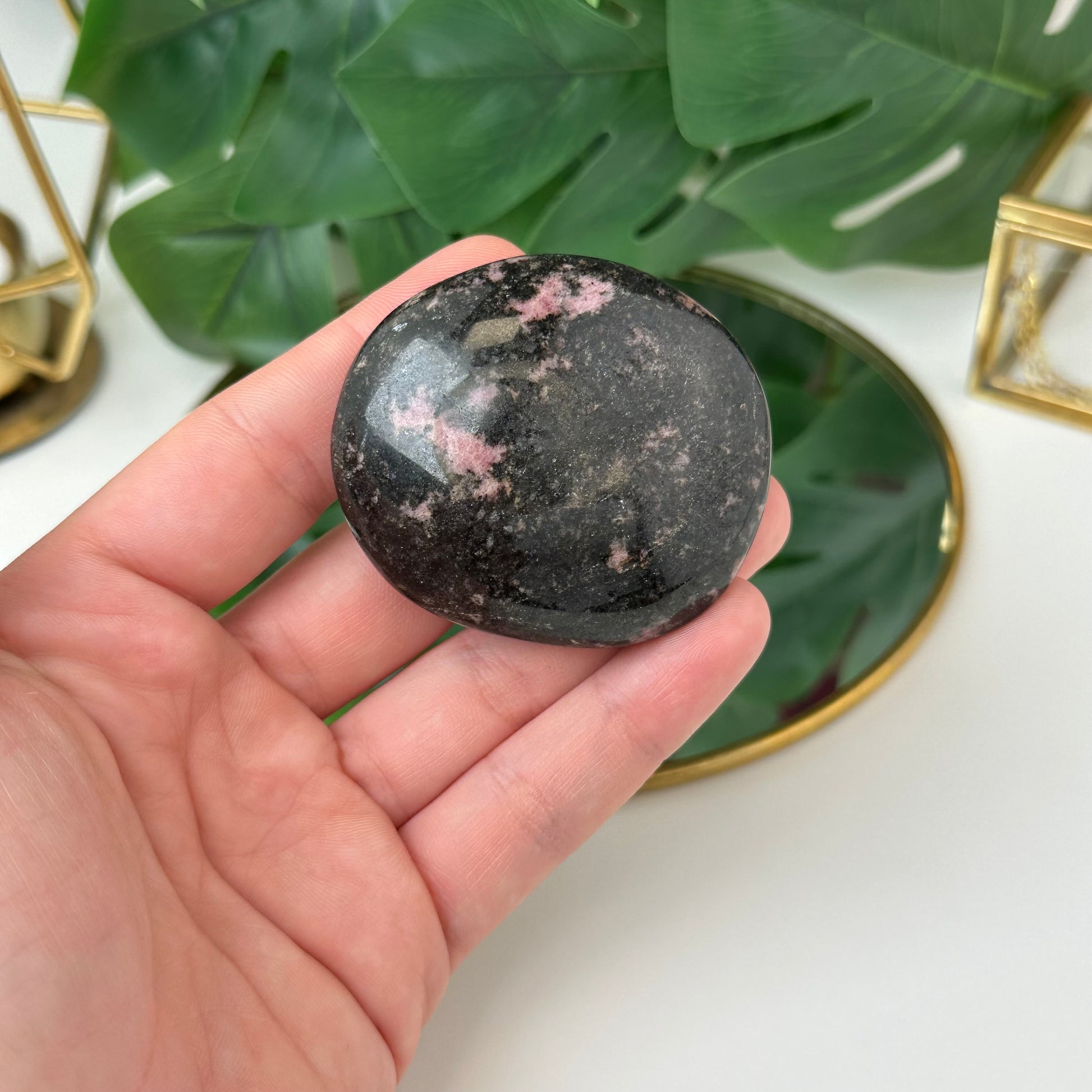 Rodonīts ir rozā un melnu toņu akmens, kas pieder silikātu minerālu grupai. Šajā eksemplārā dominē melnā krāsa ar rozā dzīslām un rakstiem, kas piešķir akmenim īpašu, kontrastainu izskatu. Tas veidojas dabā, kad mangāna savienojumi apvienojas ar citiem minerāliem. Rodonītu bieži dēvē par mīlestības un iekšējā miera akmeni, jo tas palīdz saglabāt līdzsvaru un harmoniju ikdienā.