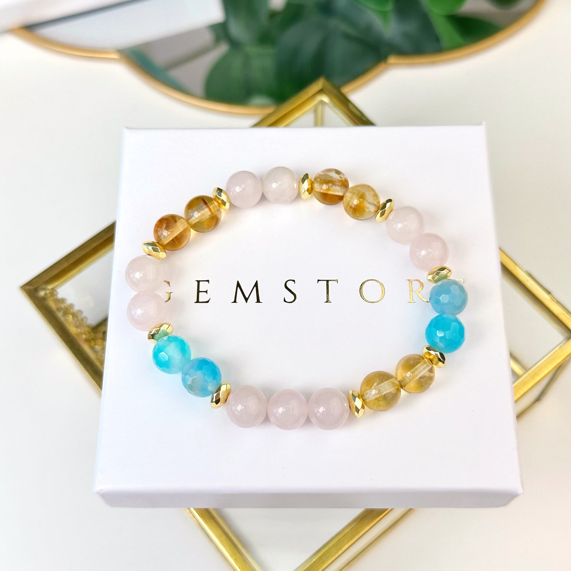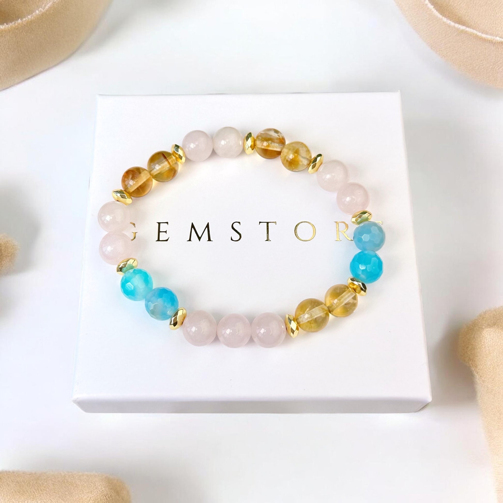 Rozā Kvarca, Ahāta un Citrīna rokassprādze (Rozā Kvarcs, Ahāts tonēts, Citrīns, 8mm. Skaistumam, veiksmei un labklājībai.)