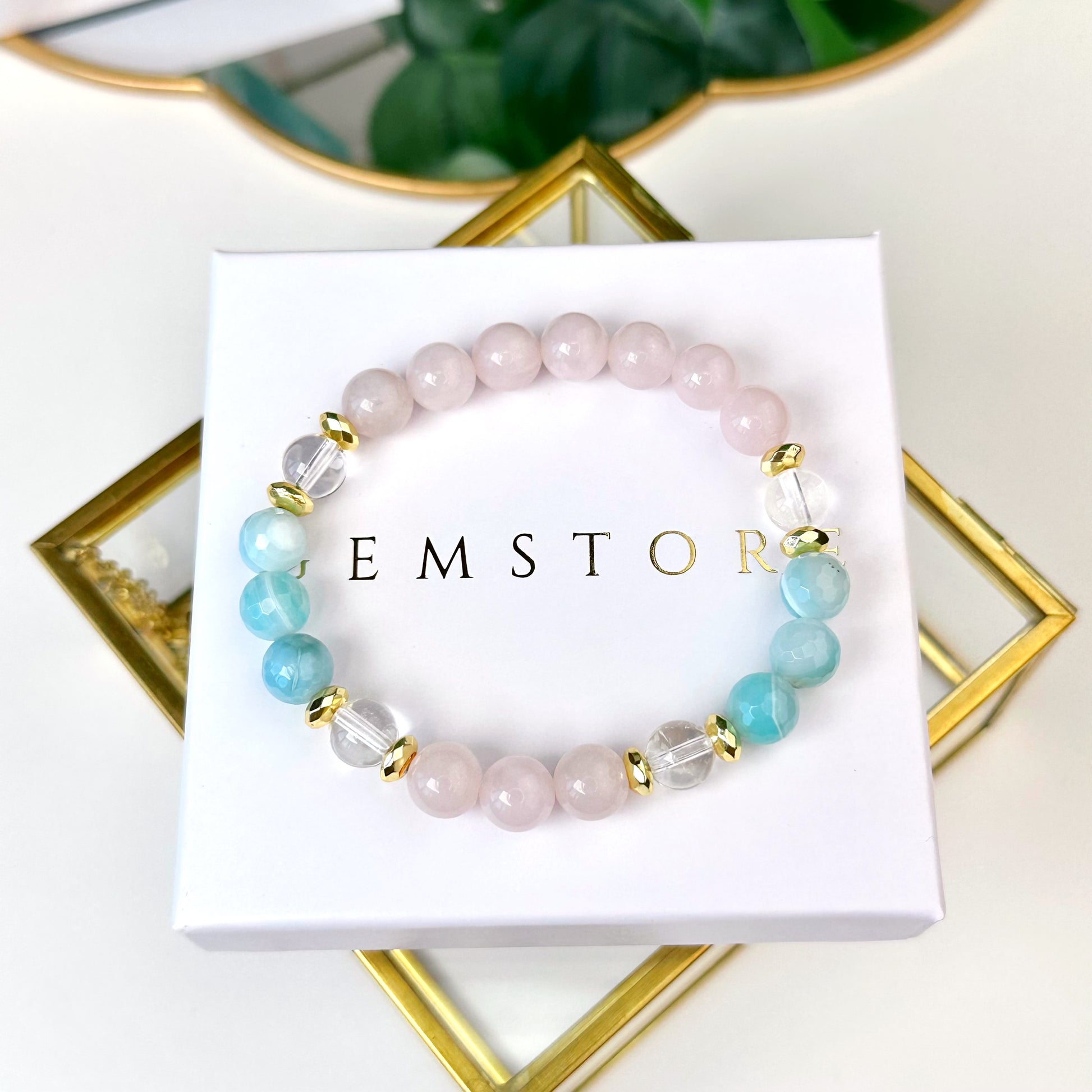 Rozā Kvarca, Ahāta un Kalnu Kristāla rokassprādze (Rozā Kvarcs, Ahāts tonēts, Kalnu Kristāls, 8mm. Skaistumam, veselībai un veiksmei.)