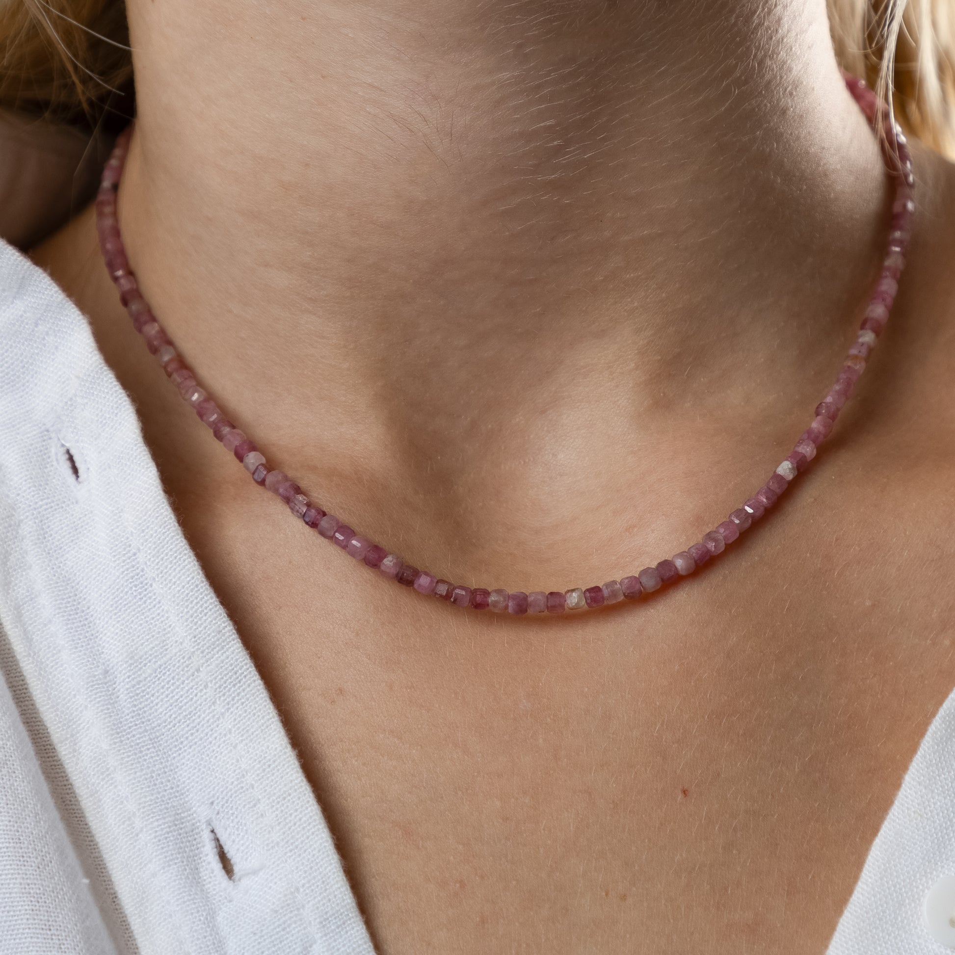 Rozā Turmalīna/ Rubelīta kaklarota (Rozā Turmalīns,3mm, 38cm. Aizdare- Sudrabs 925 apzeltīts.)