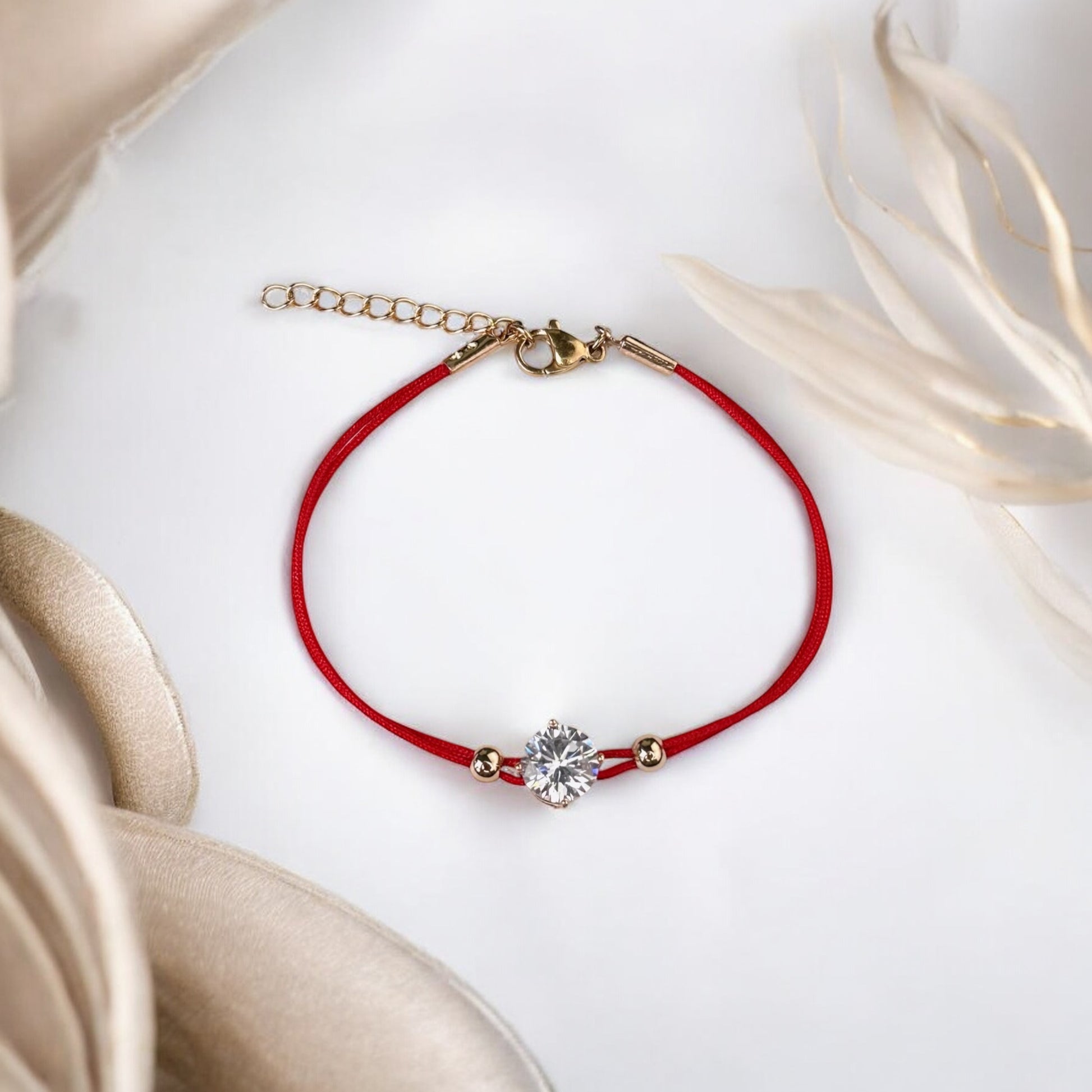 Sarkanā diega aizsardzības aproce ar kristālu (regulējams garums 16.5 cm + 3cm, zelta krāsas furnitūra)