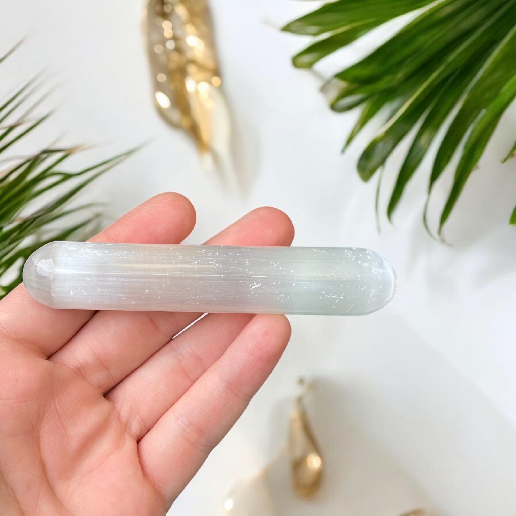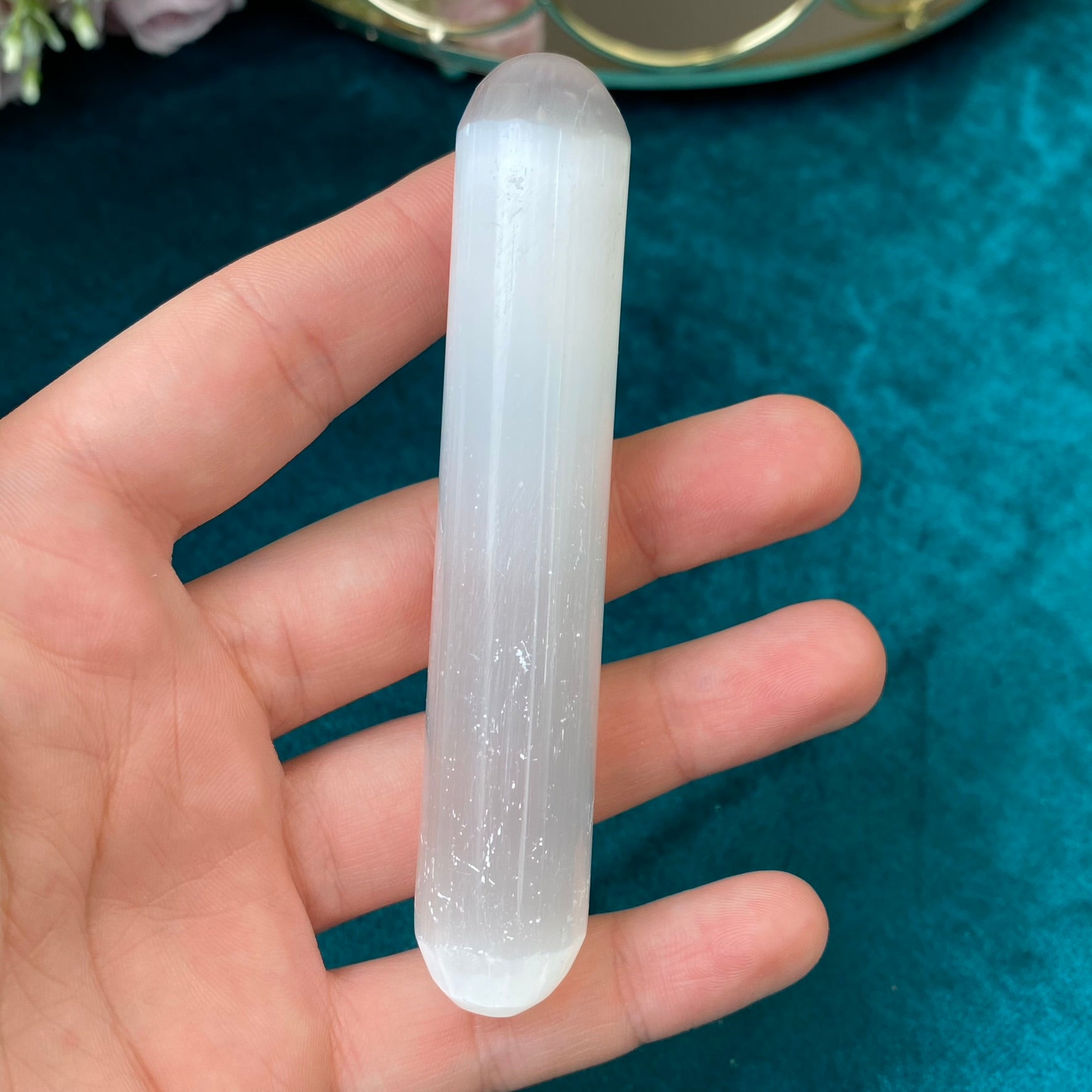 Tiks izsūtīta 1 Selenīta nūja. Tā kā katrs eksemplārs ir unikāls, tas var nedaudz atšķirties no attēlā redzamā. Aptuvenais nūjas garums 9.5-10cm.